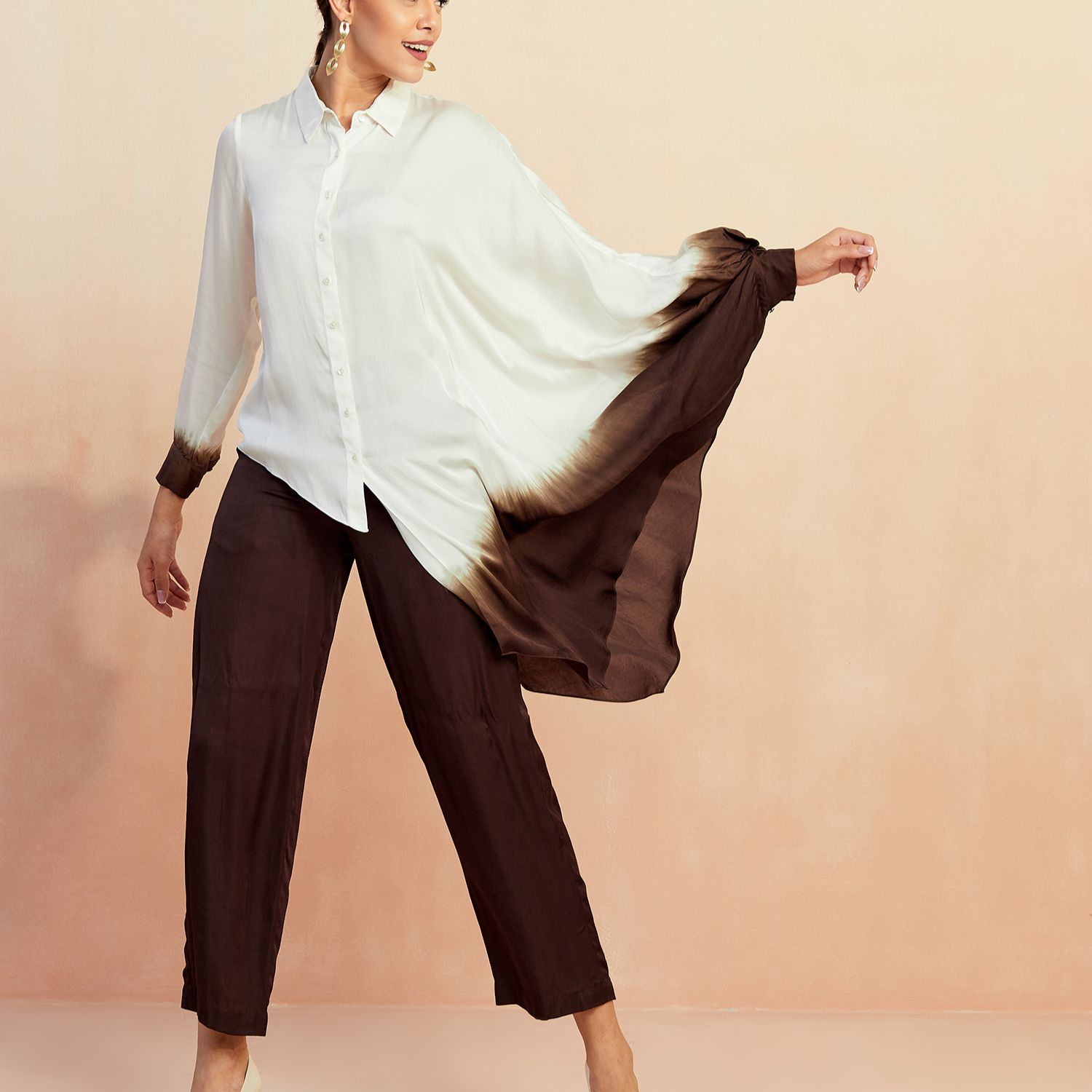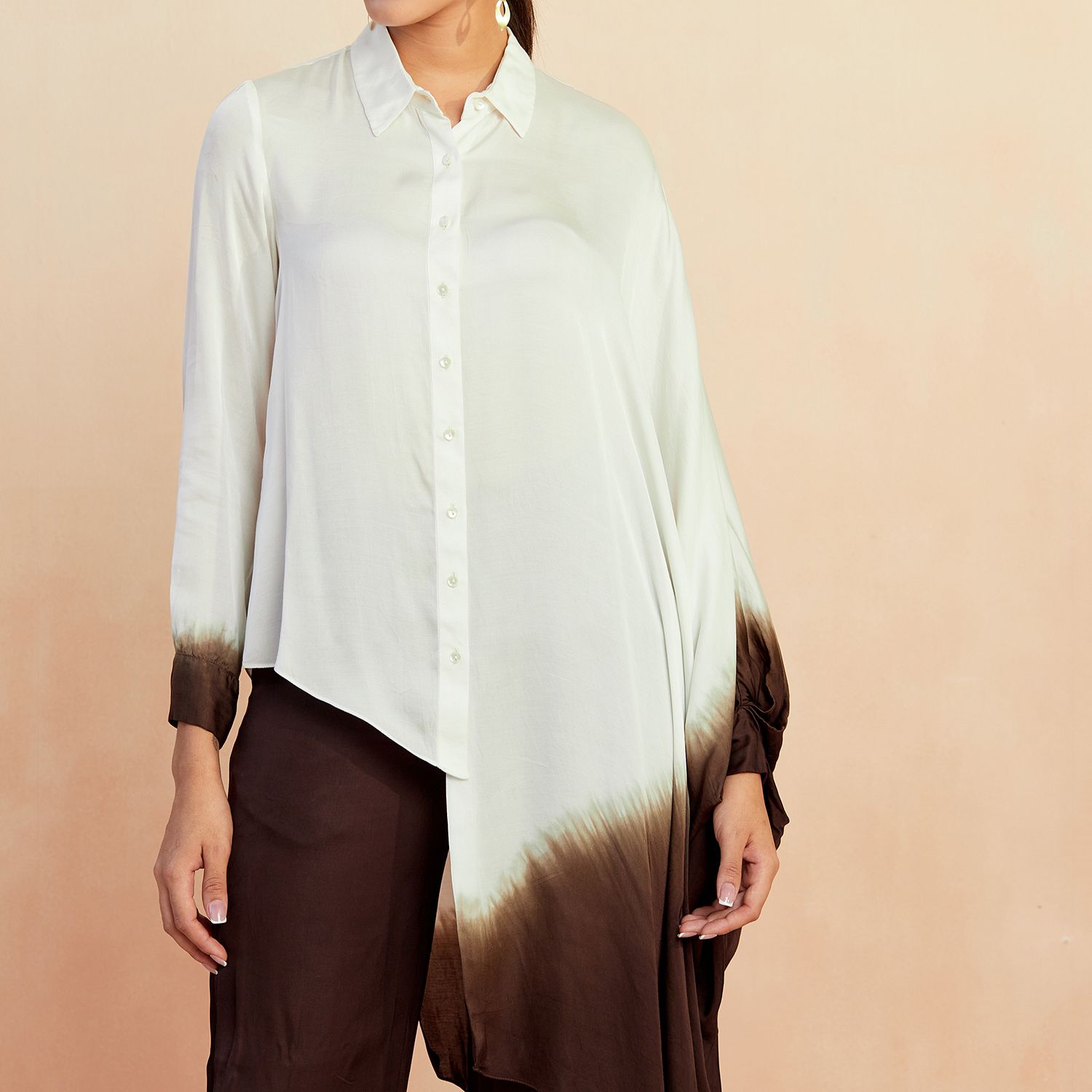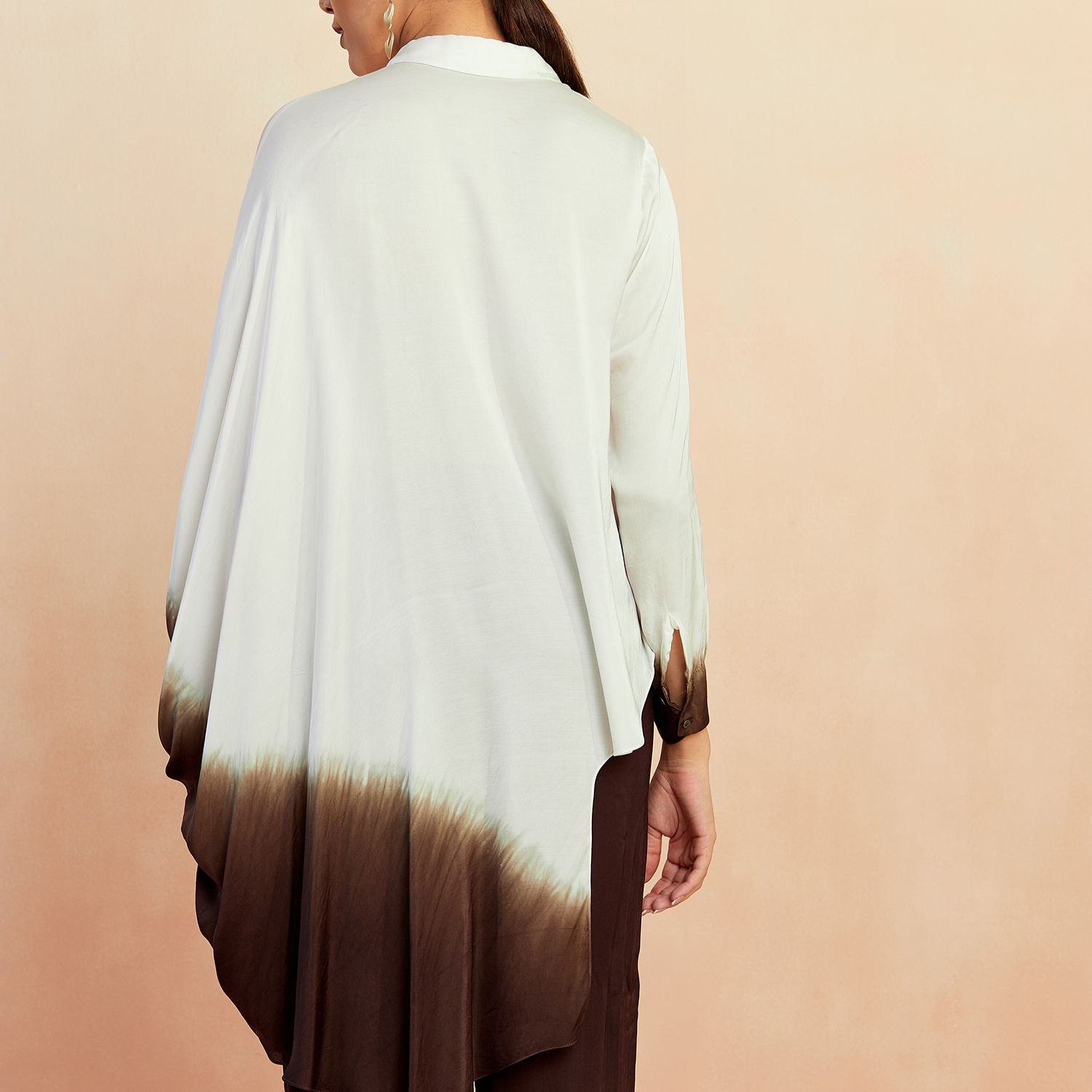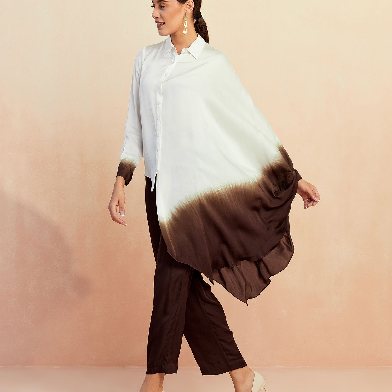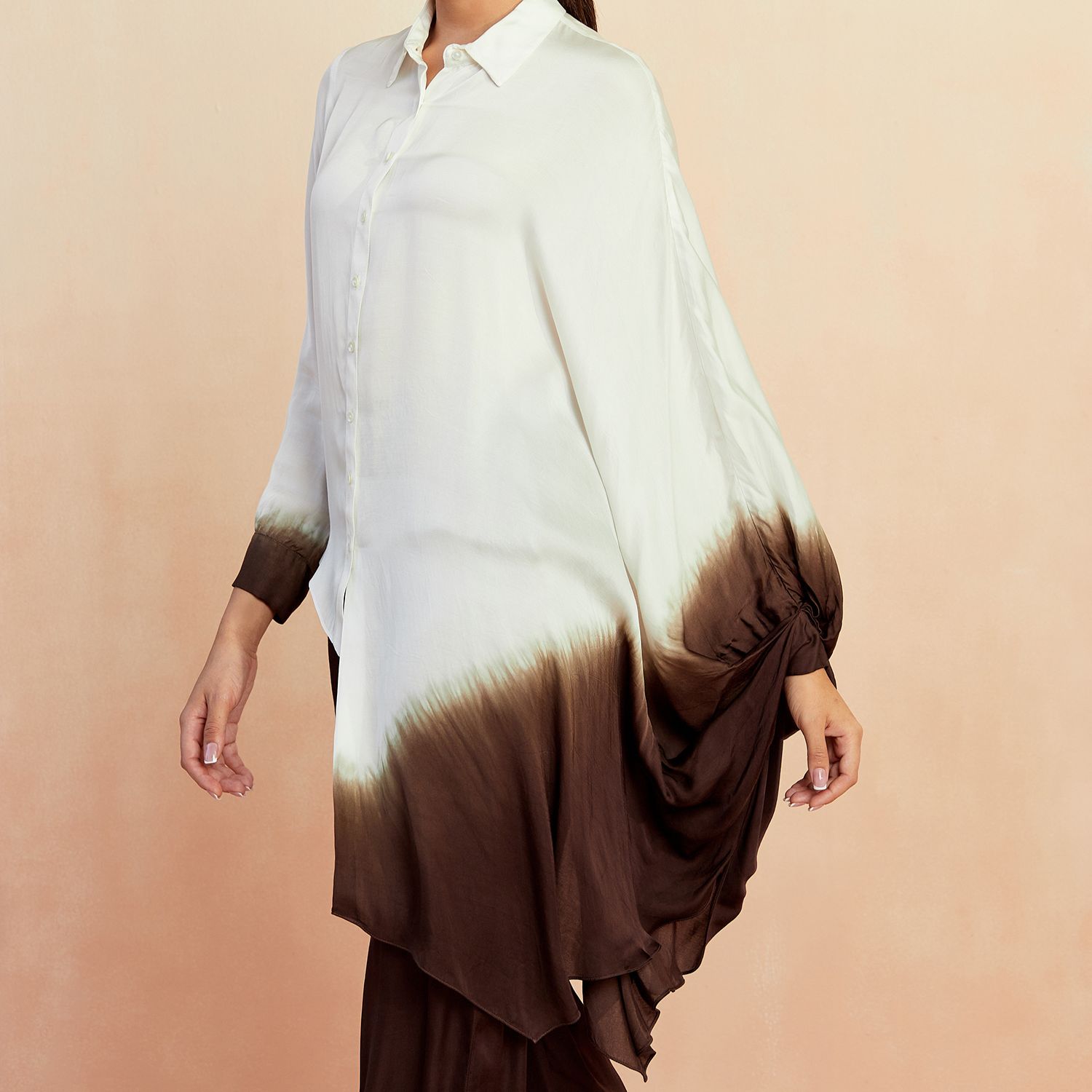 The ombre ombre co-ord set features a stunning blend of white and brown shades on smooth bemberg satin fabric. This eye-catching ensemble is a perfect choice for those seeking a chic and trendy outfit.