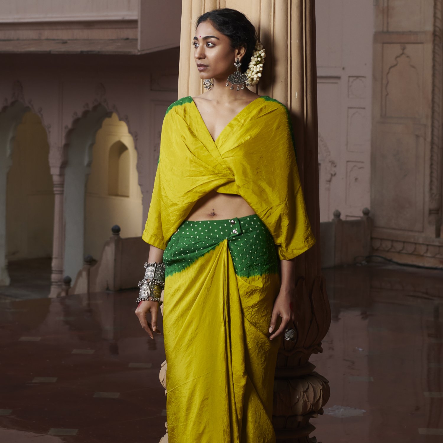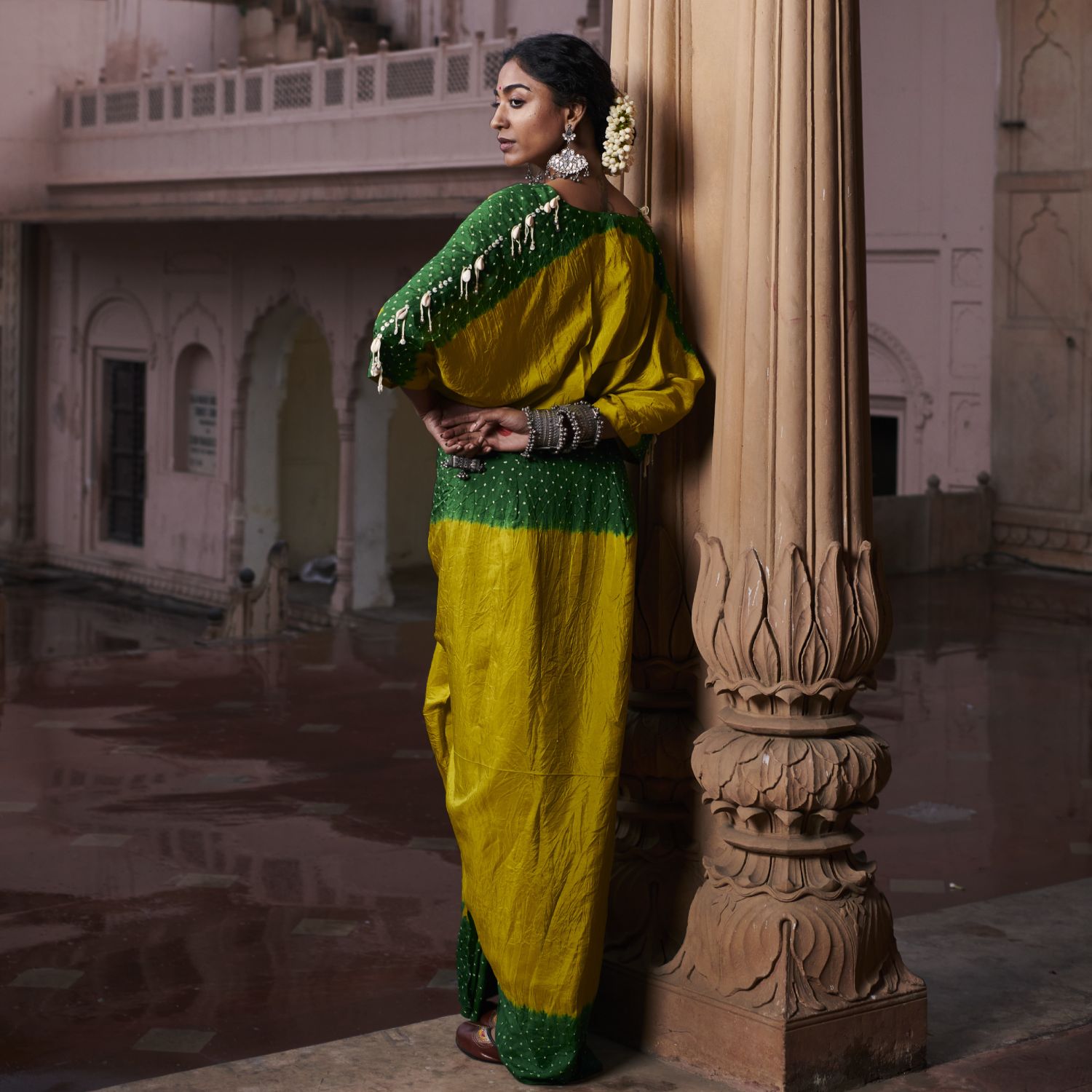 Crafted from luxurious silk fabric, this set comprises a tie and dye ombre kaftan top and a draped skirt adorned with intricate shell embroidery. The color palette features a combination of green and mustard, adding playfulness to the outfit. Style this set with bold earrings and heels for weddings and festivities.