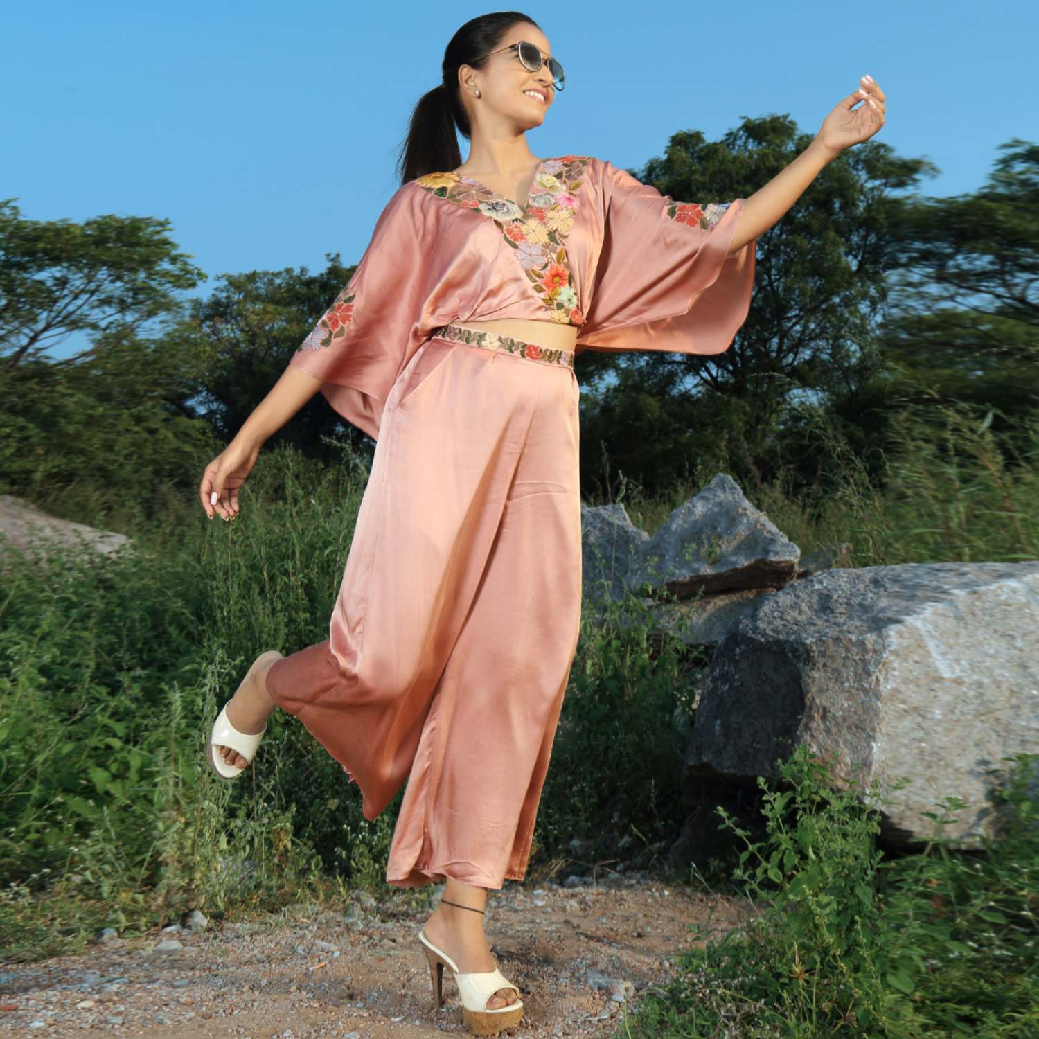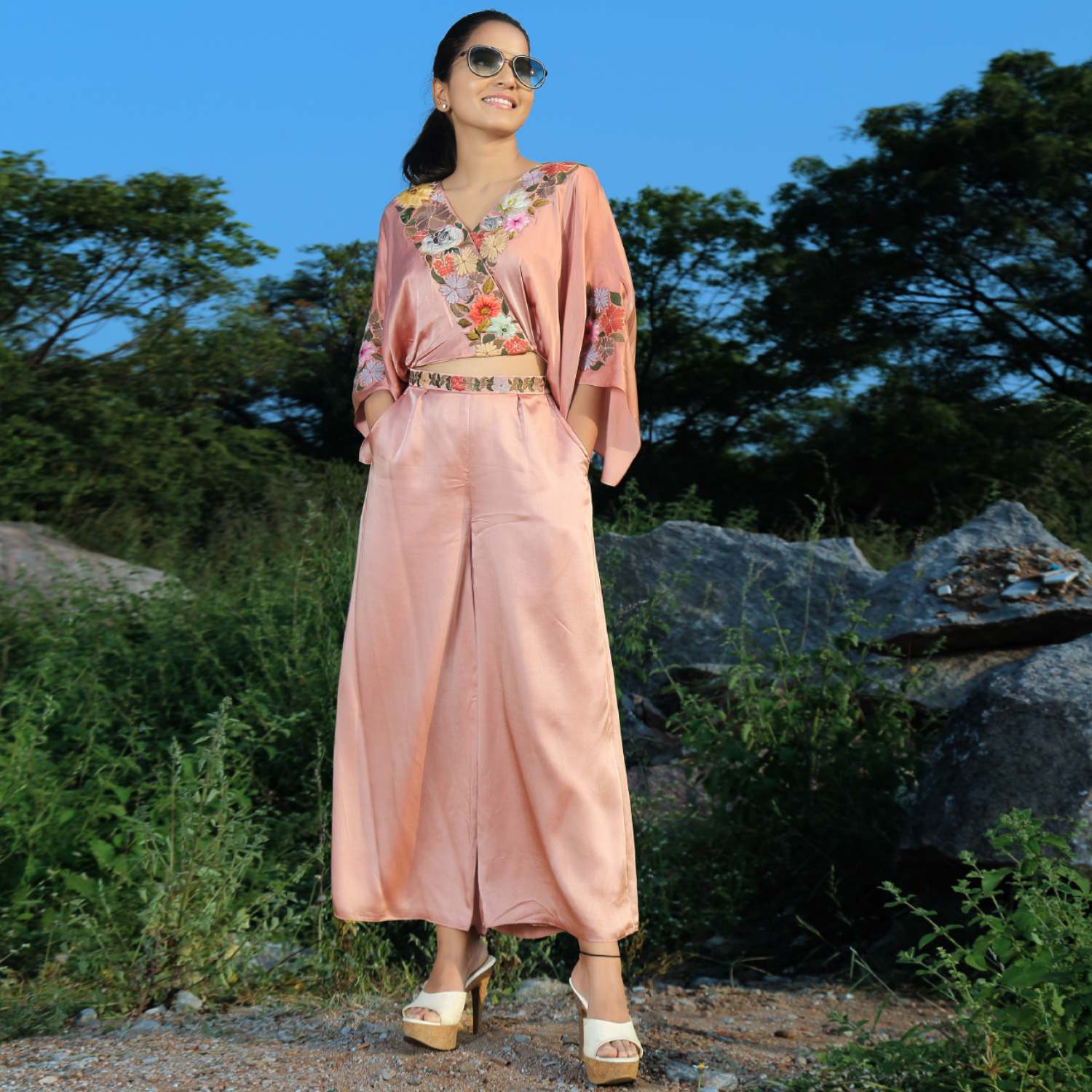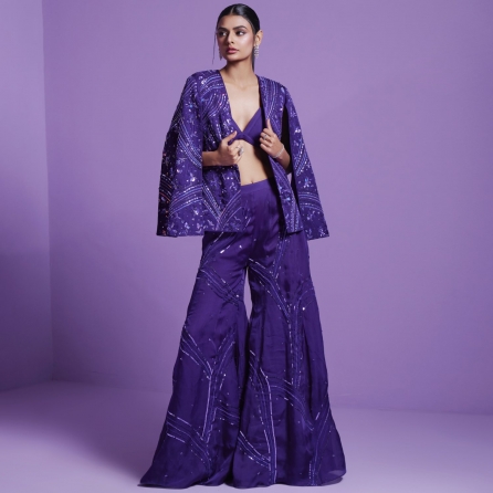 Elevate your style with a palazzo adorned by an embroidered belt, harmoniously paired with a chic cape sleeve and short top. This ensemble seamlessly blends comfort and sophistication, creating a fashion-forward look that celebrates modern design and attention to detail, ensuring a trendy and captivating appearance for any occasion.