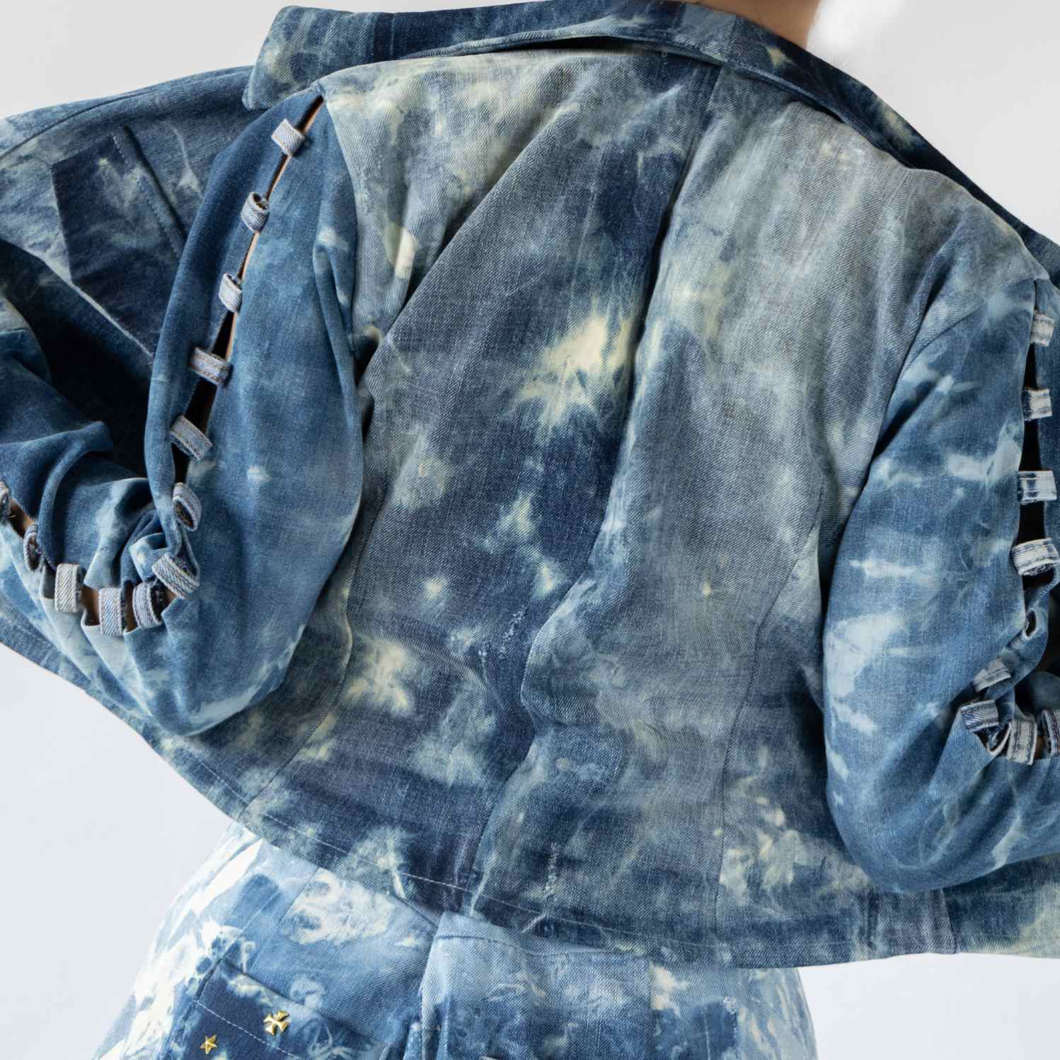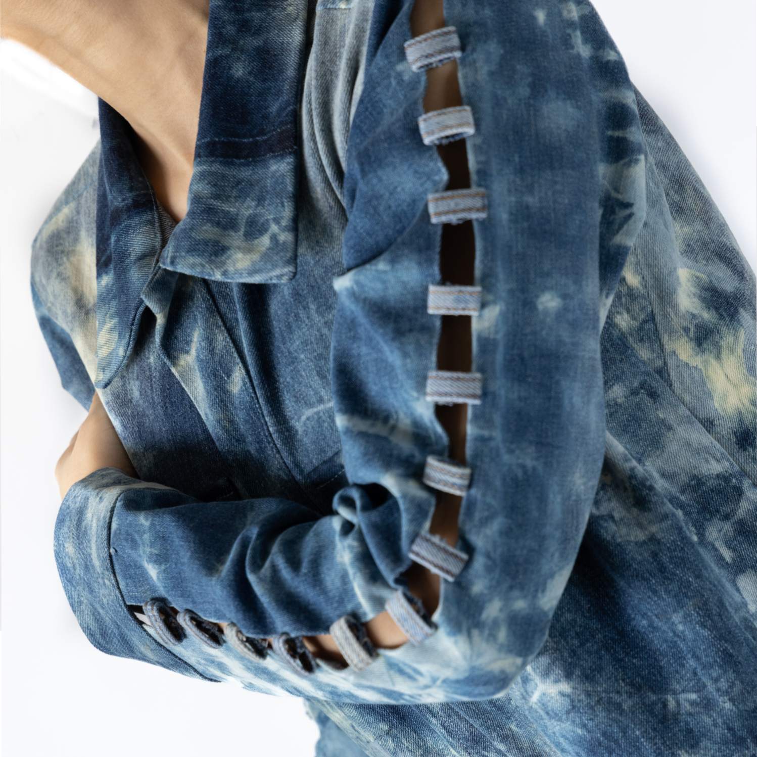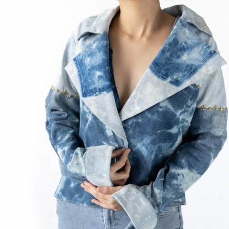It's time to elevate your layering game with this blue denim oversized jacket. This jacket was crafted by upcycling three different pairs of jeans. Style it with statement silver hoops and heels for a dressy event.