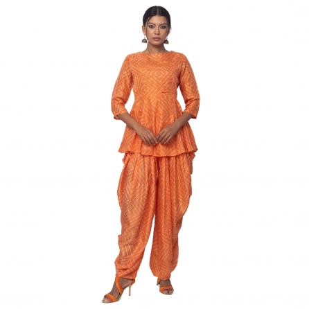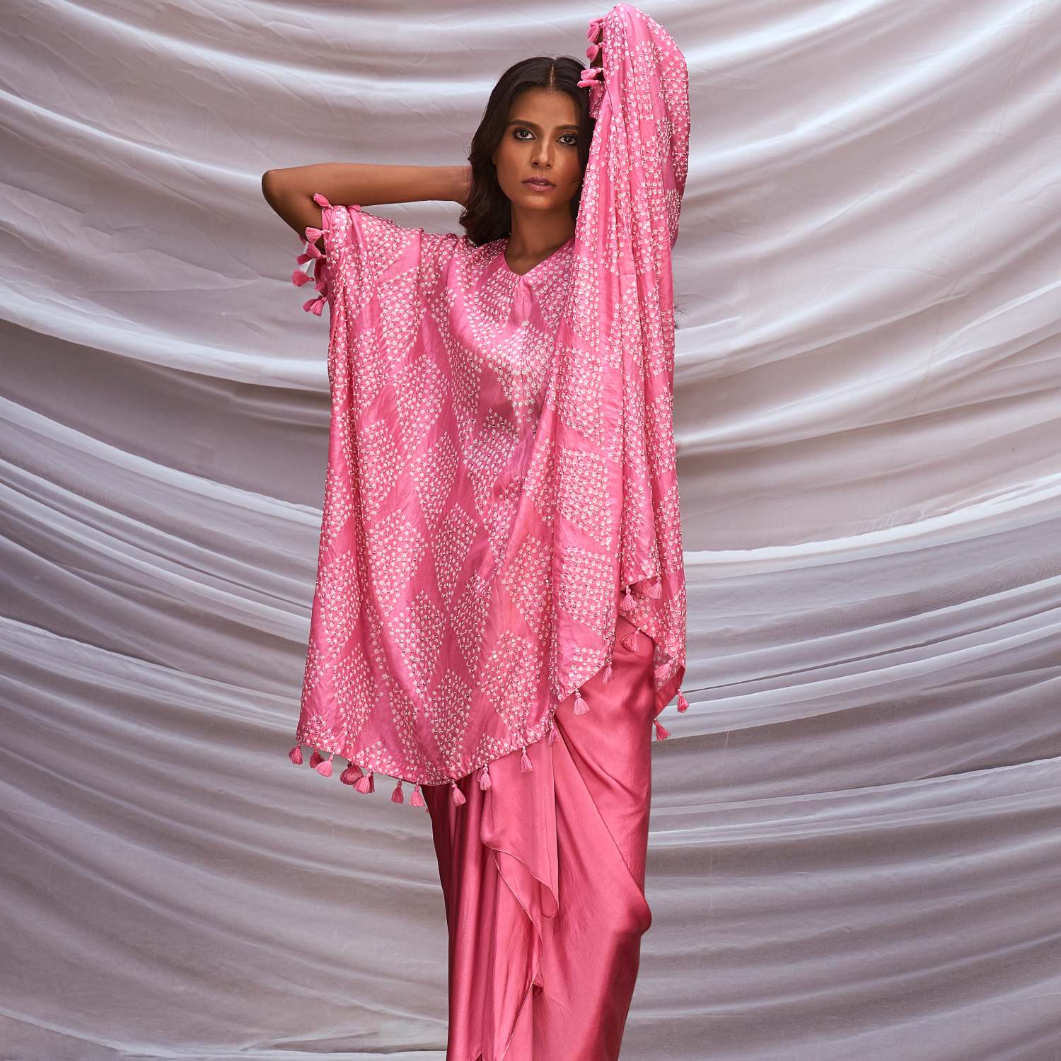 This stunning set comprises a kaftan and draped skirt with sequins and pearl embroidery crafted from luxurious silk. The kaftan features bandhani dots in a kite pattern and tassel detailing on the hemline and sleeves, offering playfulness. Style it with delicate jewellery and strappy sandals for weddings and festivities.