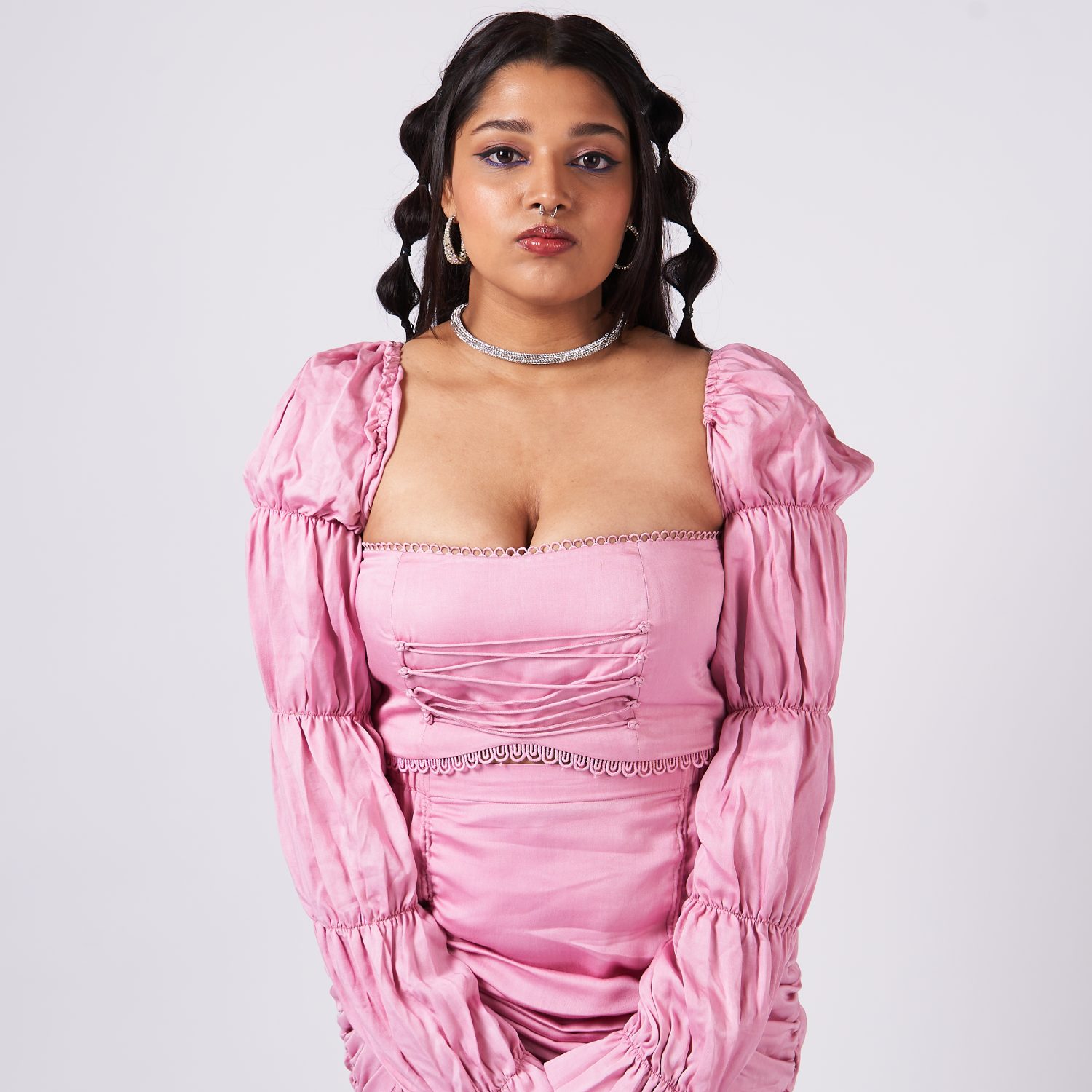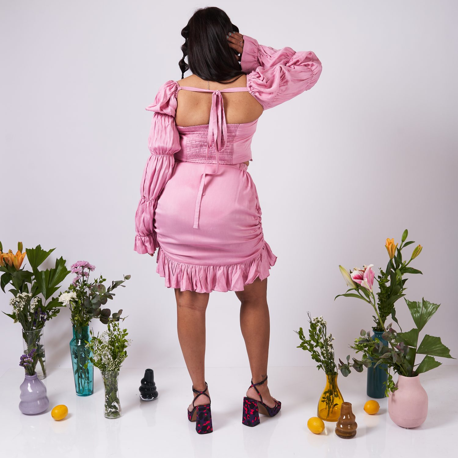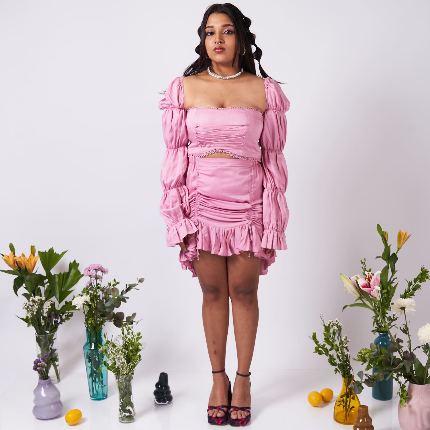 Elevate your wardrobe with this two-piece coordinating set showcasing a bubble sleeved fitted top and a ruffled skirt adorned with drawstrings, all in a solid color. This ensemble exudes sophistication, offering a timeless and versatile look that seamlessly transitions from casual to formal occasions with effortless elegance and modern flair.