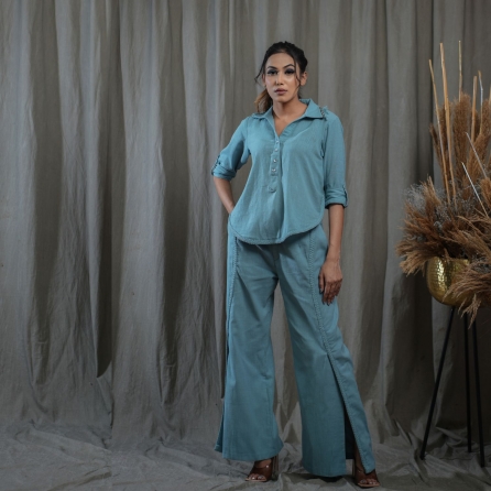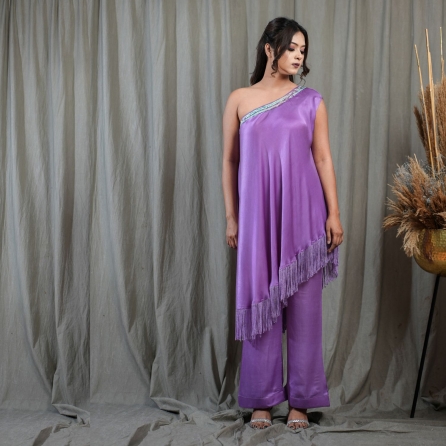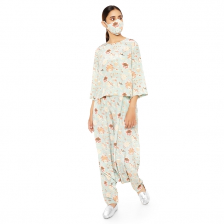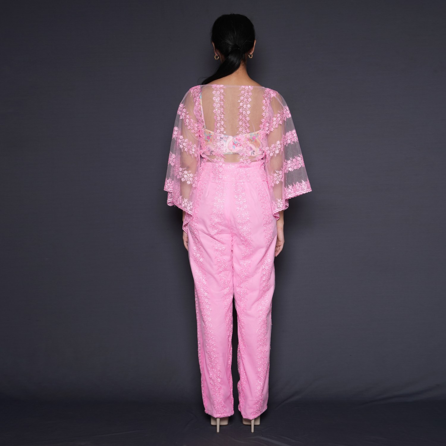 This beautiful pink set features a net cape, floral printed phantom blouse, and high-waisted pants. The short-length cape is made of net fabric and is adorned with sequin embellishments that catch the light beautifully. Pair it with statement earrings, heels, and a sling bag for weddings or festivities.