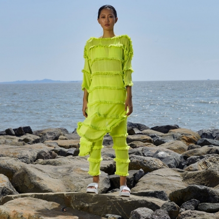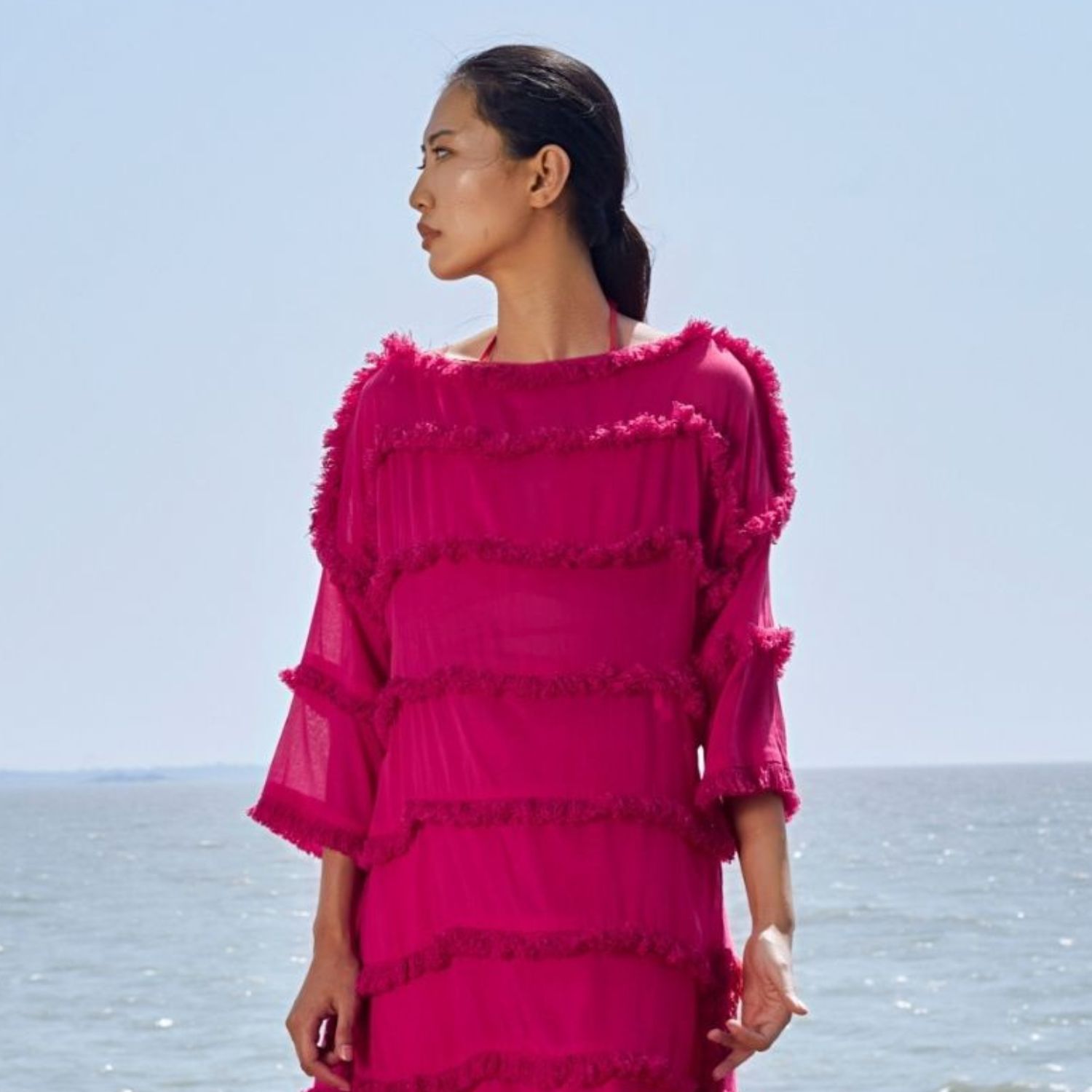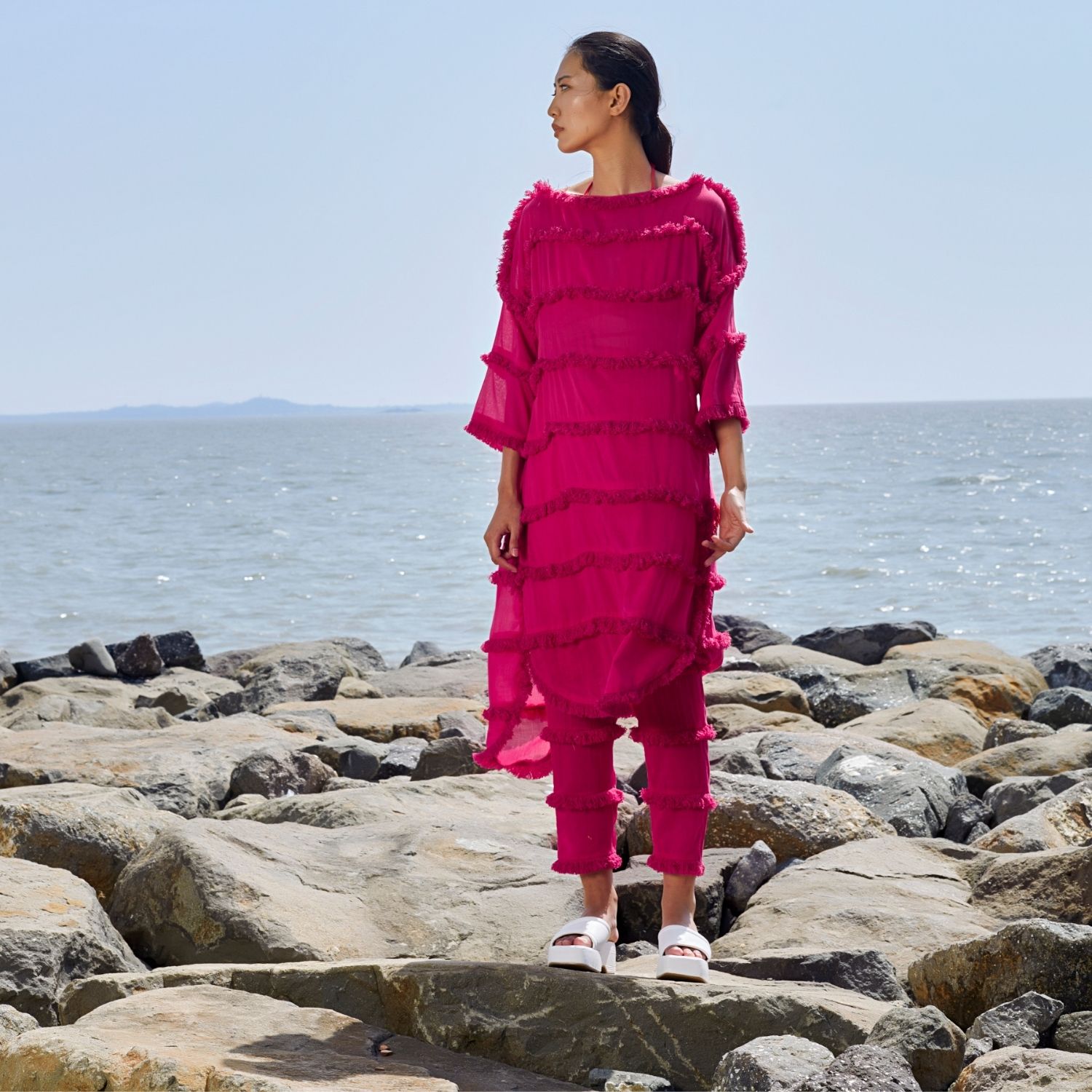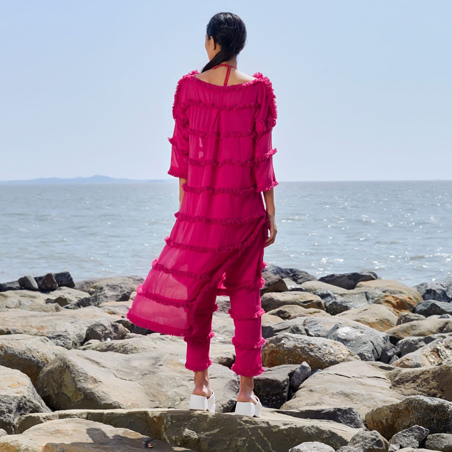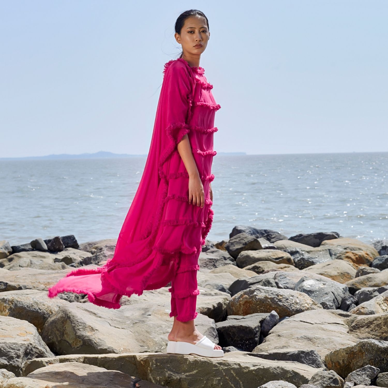 ₹ 28,800 (5% off)Elevate your style with this captivating ensemble featuring an apple-cut tunic and pants. The pink tunic showcases a flattering silhouette, while the pants offer side pockets for added convenience. Delightful tassel detailing at every tier adds a touch of bohemian charm, making this set a perfect blend of comfort, functionality, and trendy sophistication.