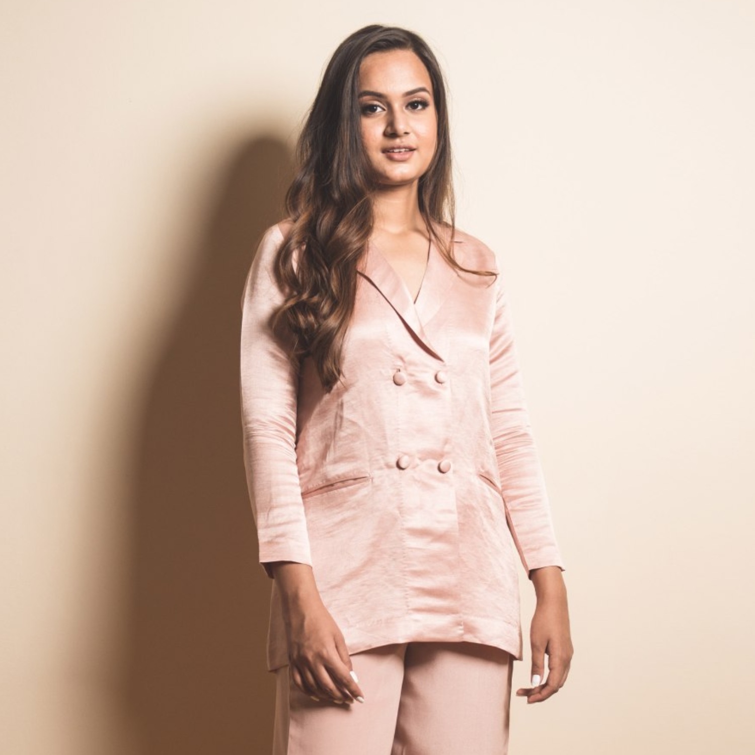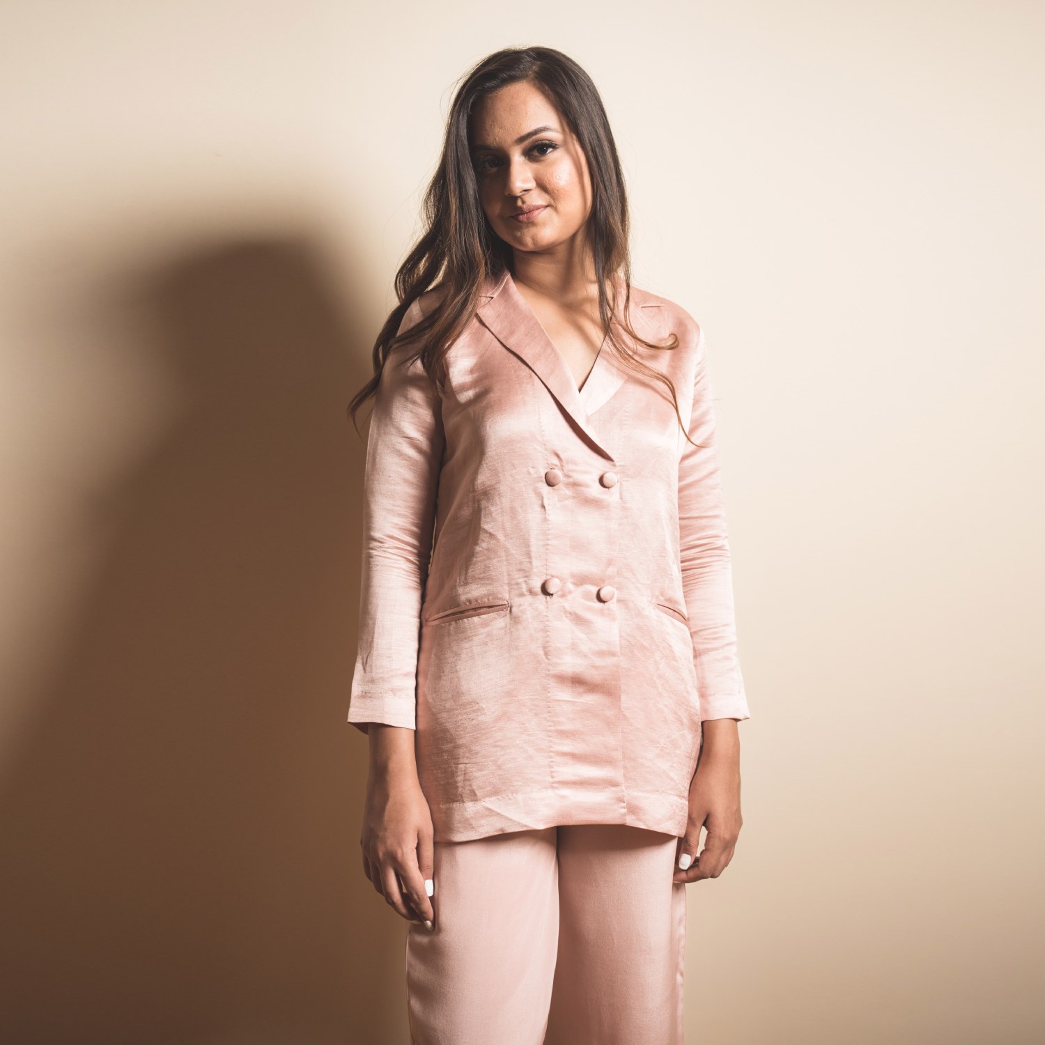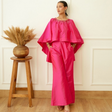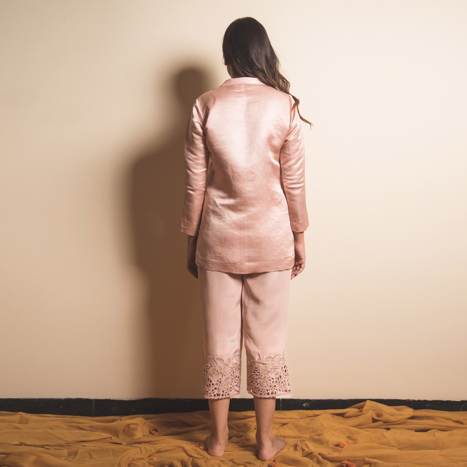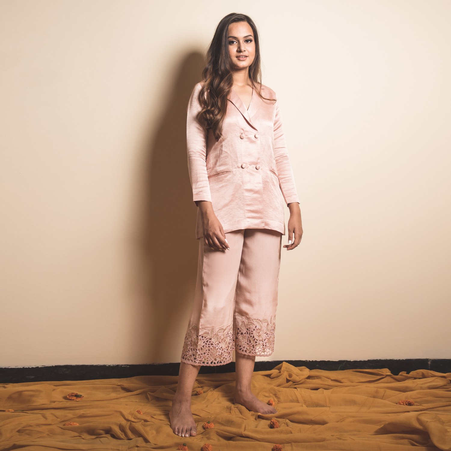₹ 15,000 (10% off)This set features a double-breasted linen silk jacket in a stunning powder pink shade, that exudes timeless elegance. Its impeccable tailoring evokes the essence of classic couture. Paired with pure crepe culottes, adorned with exquisite cut-work embroidery, this set combines comfort with haute couture.