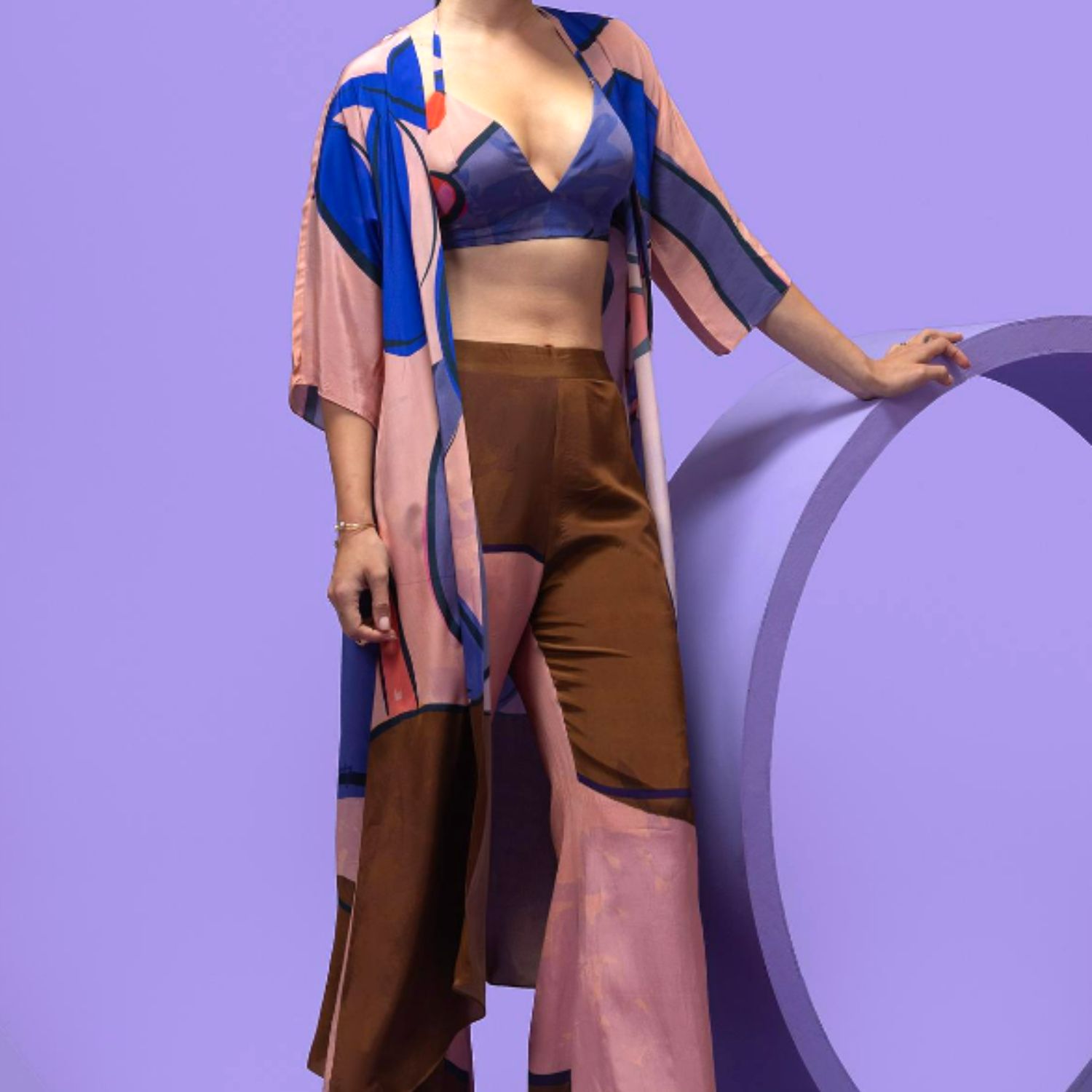₹ 18,000 (5% off)Add a touch of sophistication to your wardrobe with our fabulous printed co-ord set. Designed with an artistic flourish, this three-piece set boasts a bustier with a cape and wide-legged trousers in choco brown and blush blue.