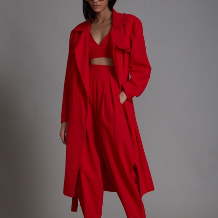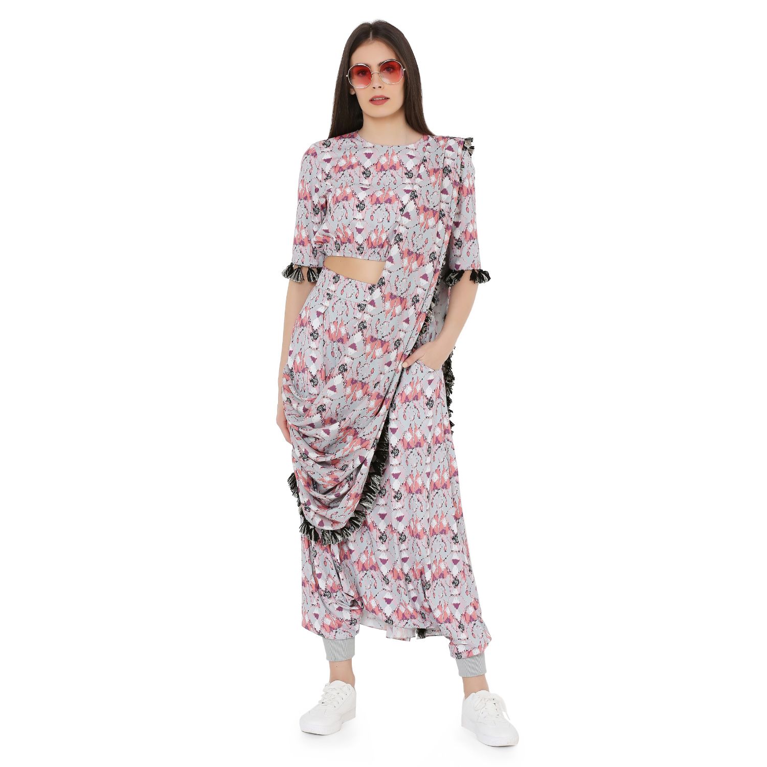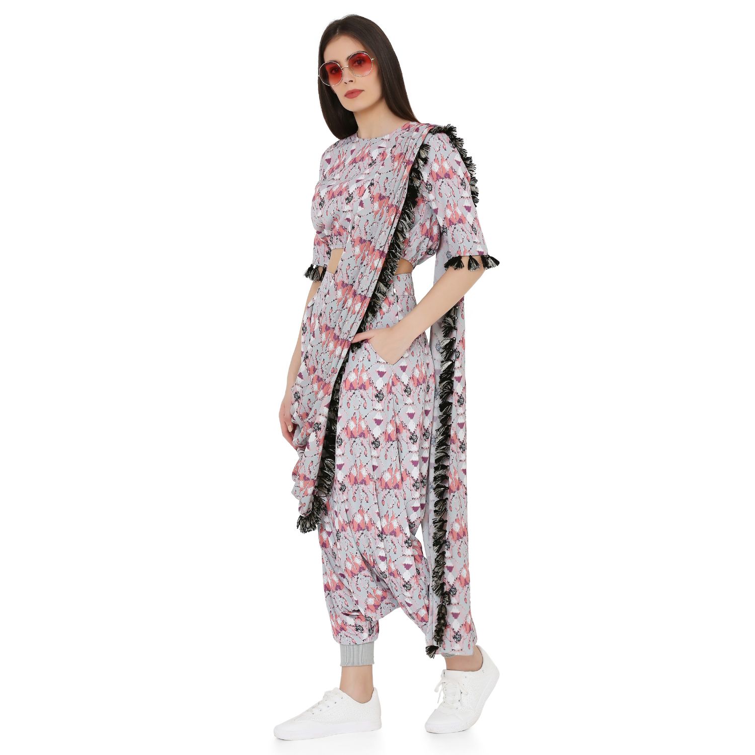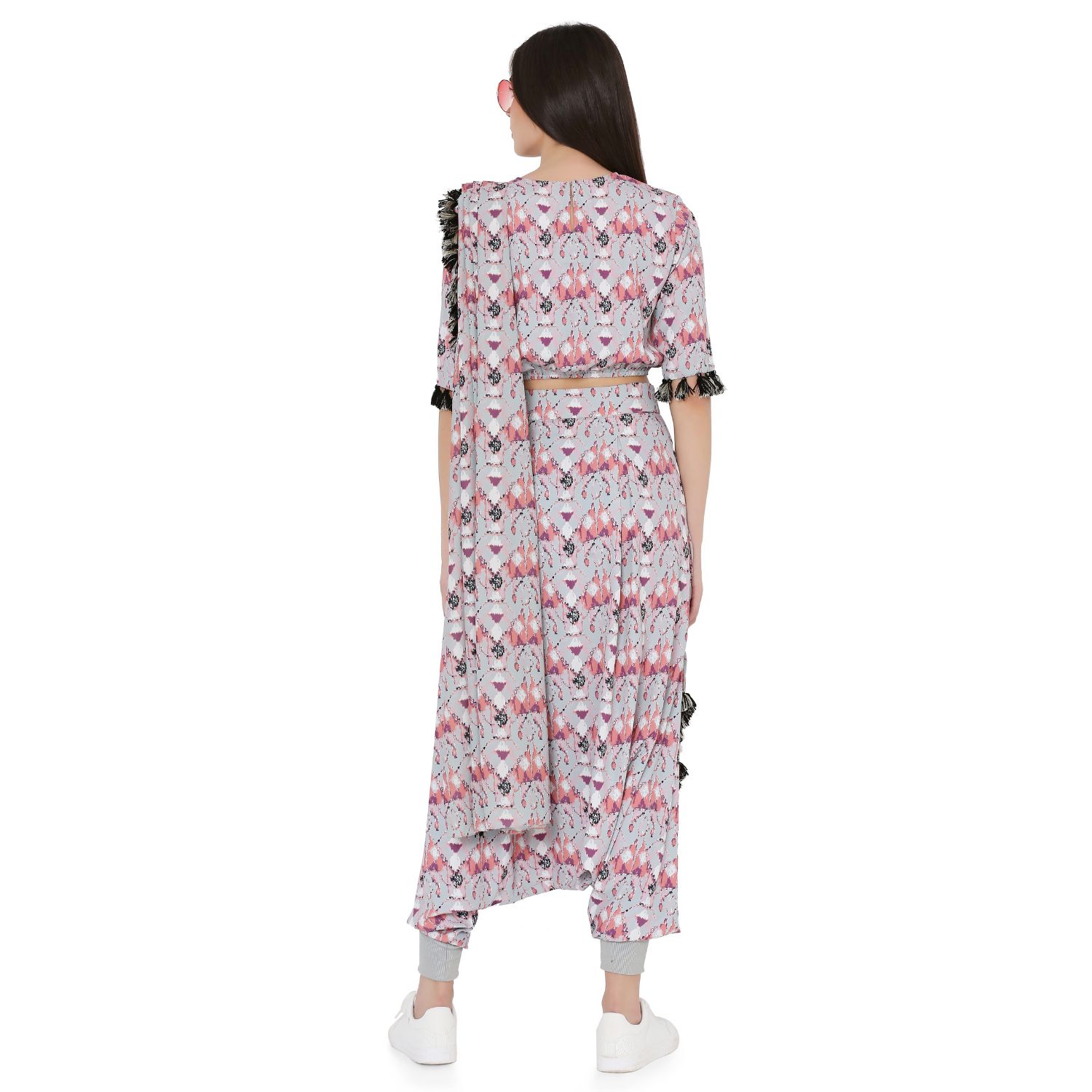 Cut in butterfly print crepe this balloon top is paired with comfortable low crotch pants. The silhouette of this ensemble offers both style and comfort. The attached georgette drape dupatta with tassel detailing completes the look which gives it an ethereal appearance.
