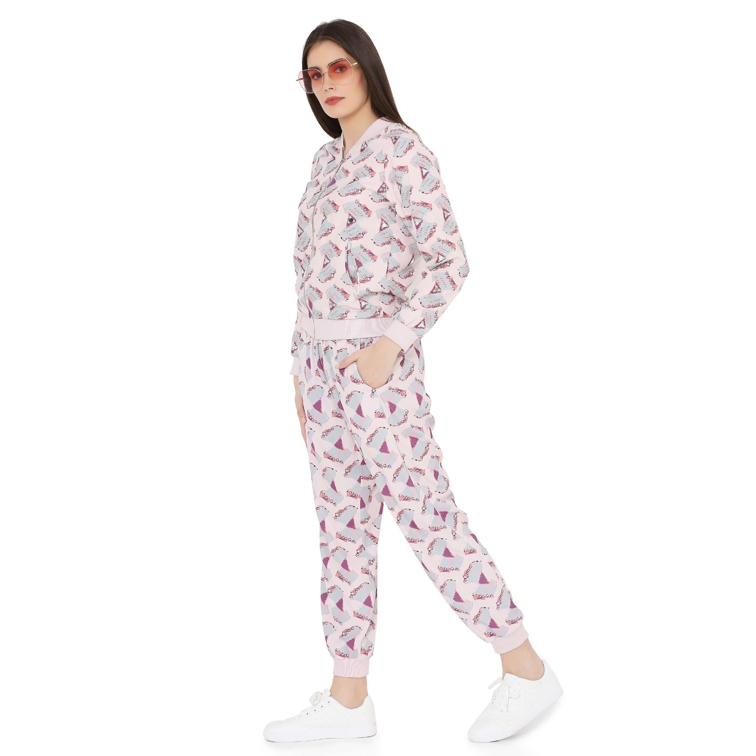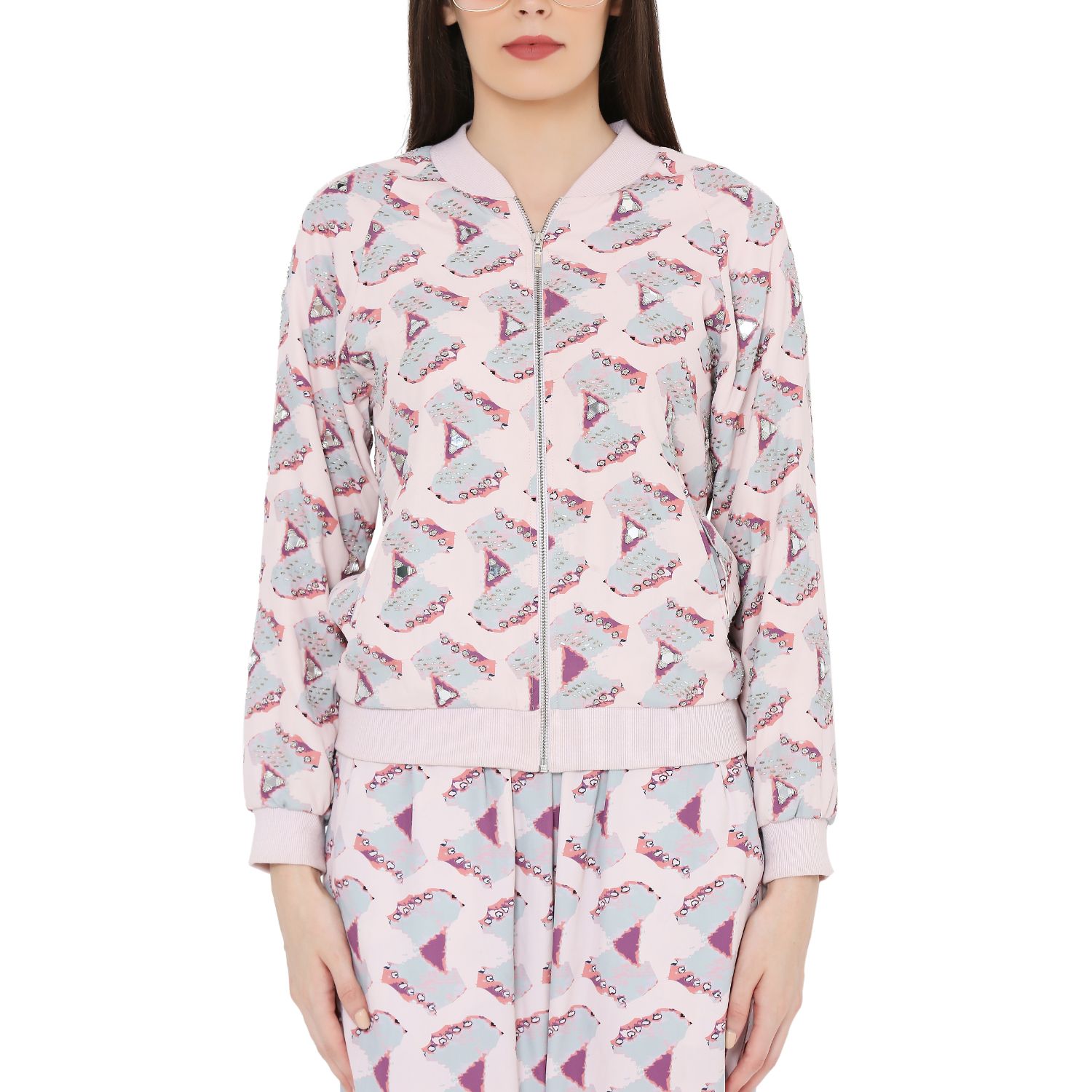 This trendy butterfly print bomber jacket is cut in a crepe fabric. It comes with matching jogger pants to elevate your style quotient. Pair this summery outfit with wedges for a day event.