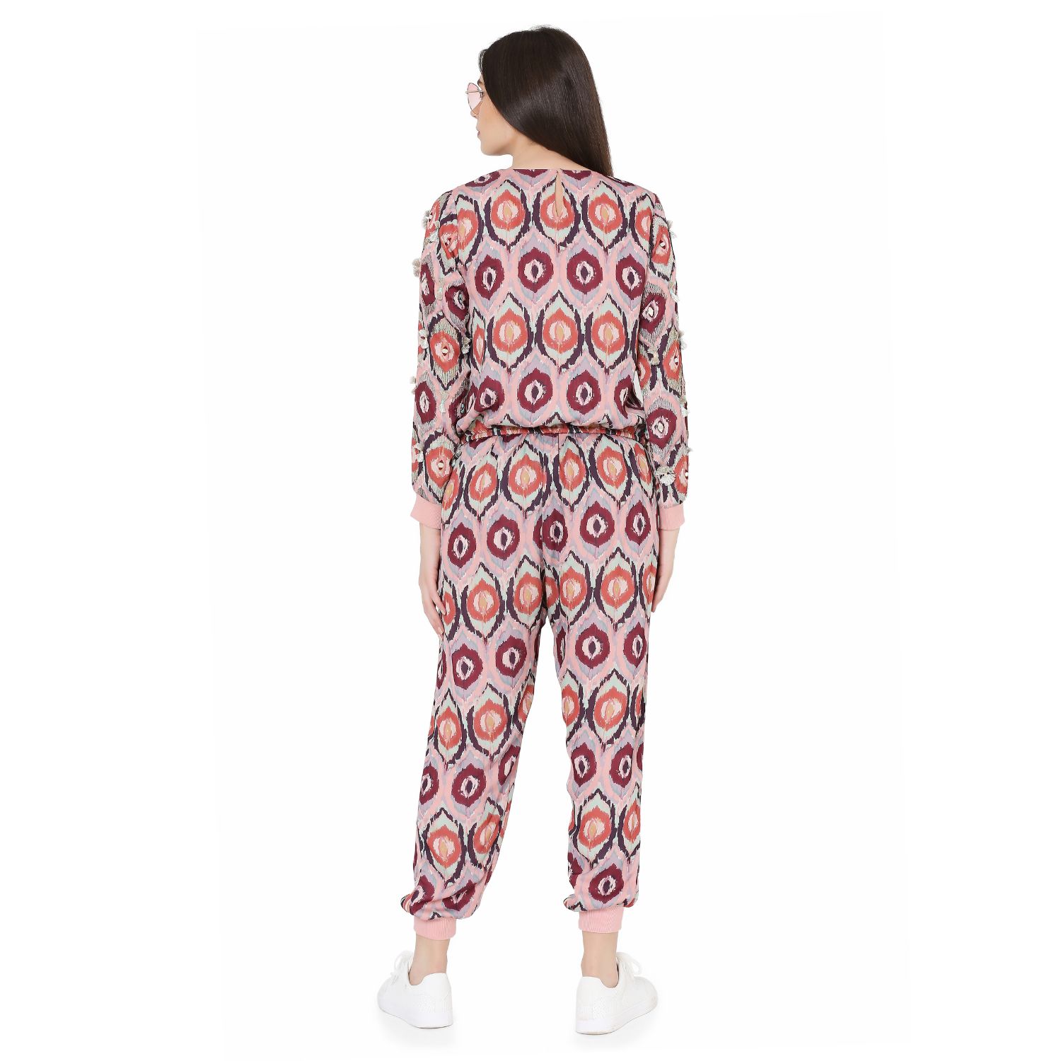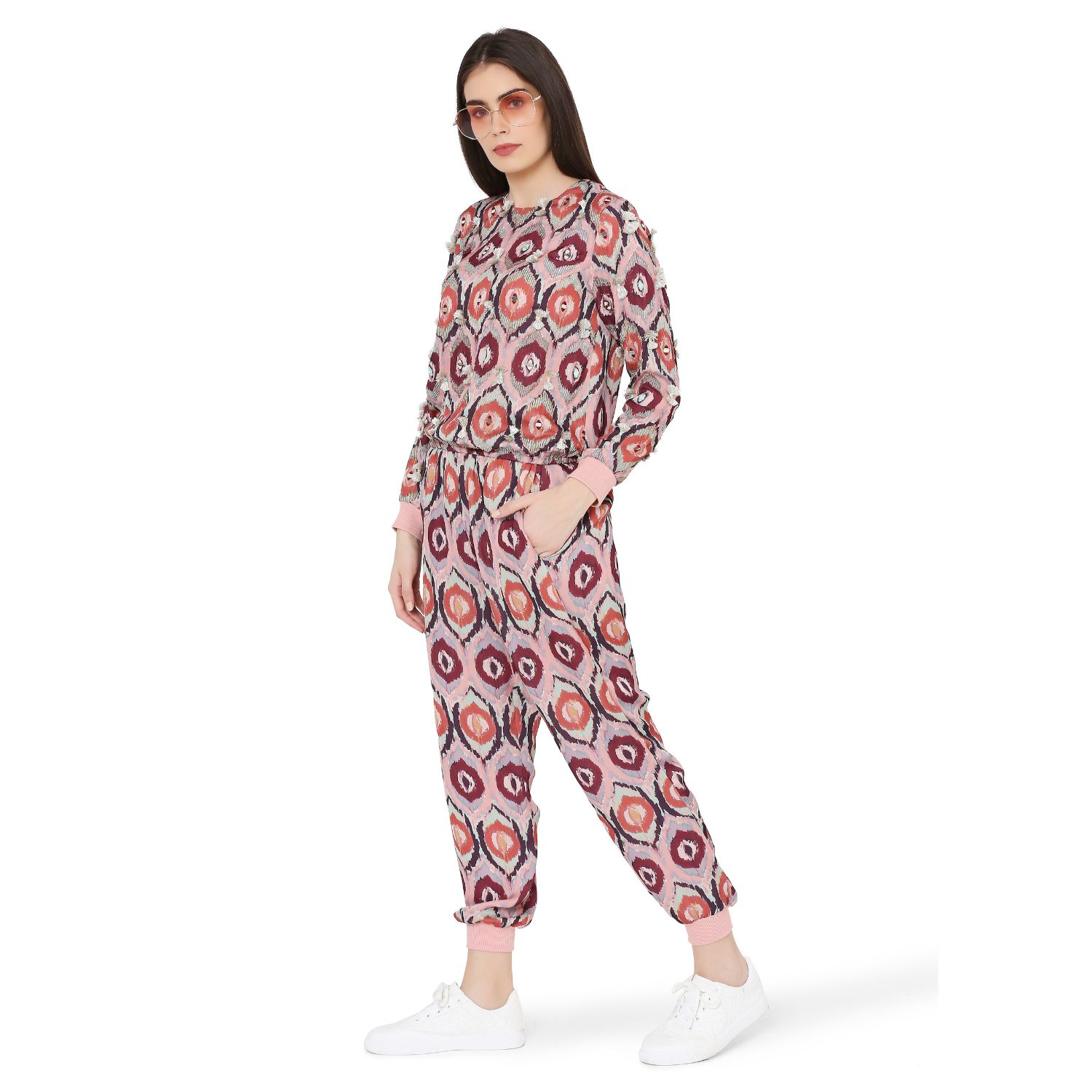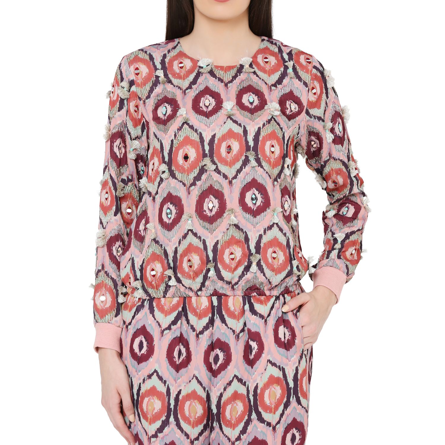 This captivating top is crafted with luxurious art silk. It features intricate red Ikat eye print embroidery and is paired with comfortable joggers. This ensemble offers the perfect amount of style and comfort. Style this set with statement jewellery for a day time party.