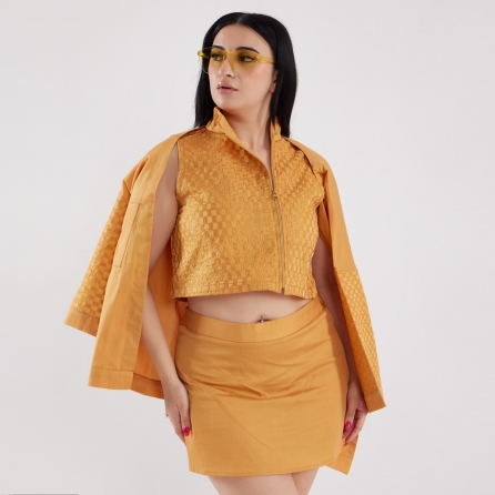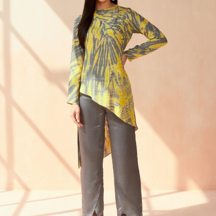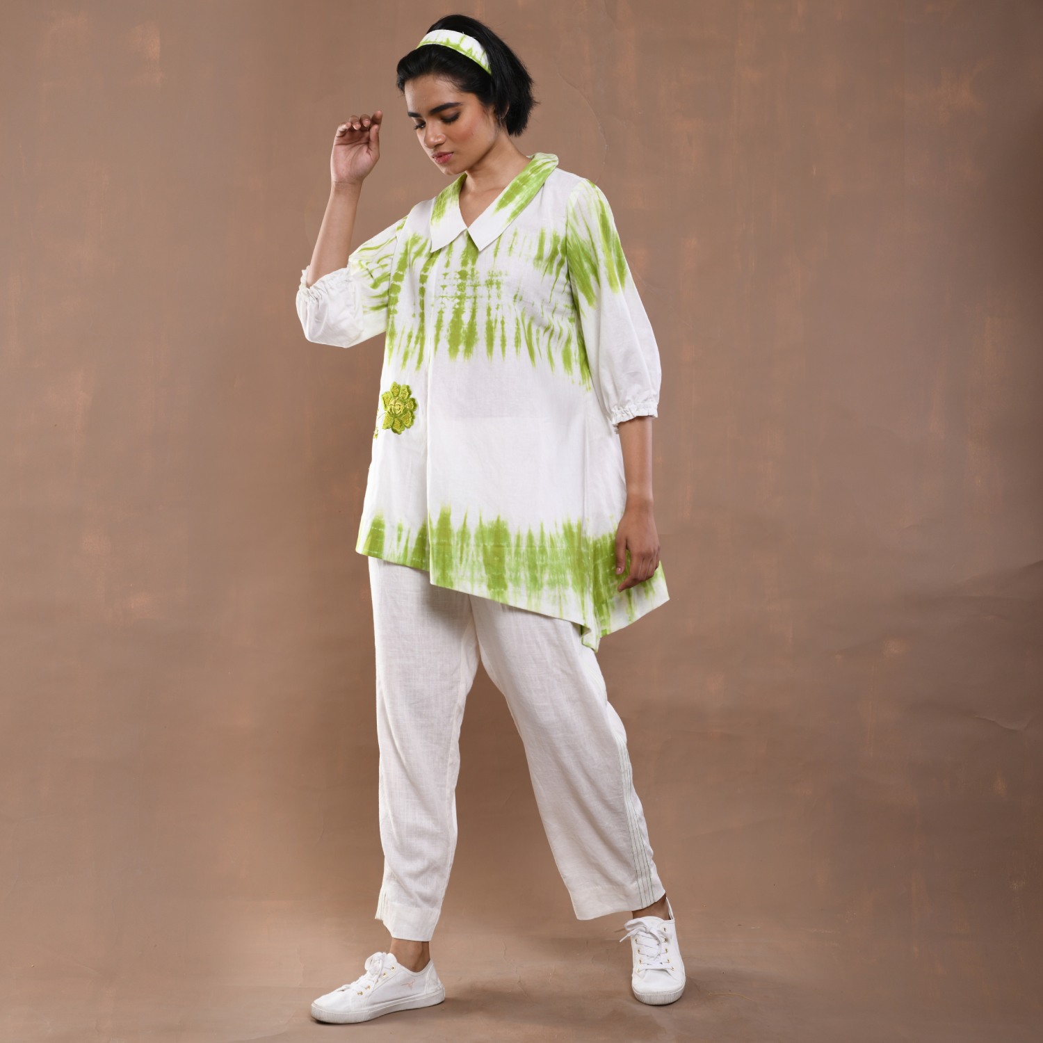 ₹ 8,599 (20% off)This tie-dye set features beautiful floral embroidery with hand-threaded details. The top is a short shirt-style piece with an abstract cut featuring stylish peter collars and gathered sleeves. The set includes white relaxed-fit pants made from comfortable linen fabric. Style it with minimal jewellery and neutral sandals for a day out with friends.