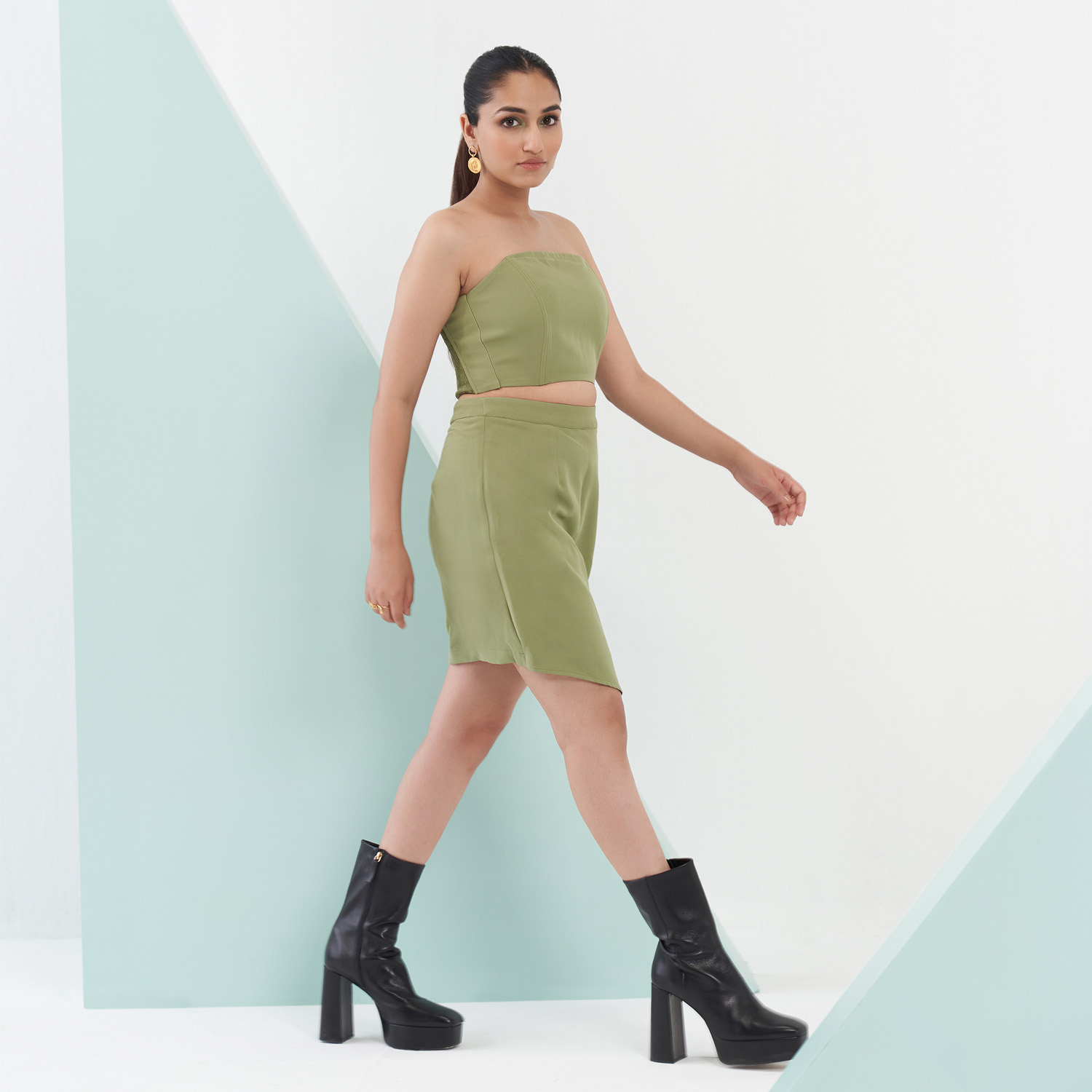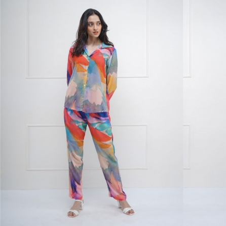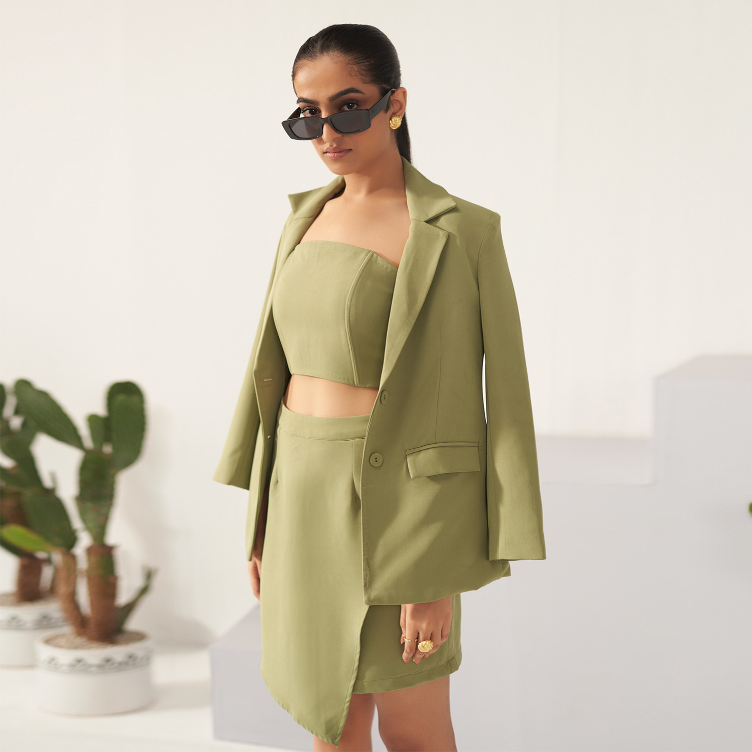 ₹ 16,500 (10% off)This three-piece co-ord set features an asymmetrical hemline on the skirt, a corset crop top and a full sleeve, double collared jacket with side pockets. Style it with bold earrings and a sling bag for a dressy evening event.