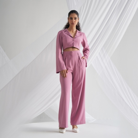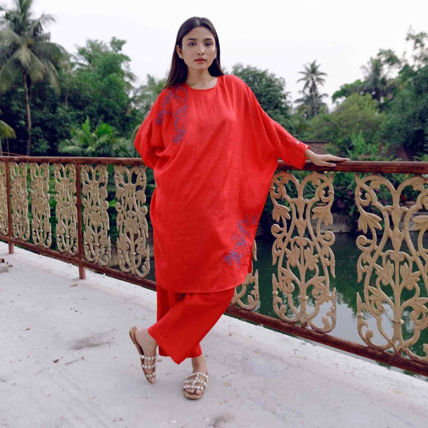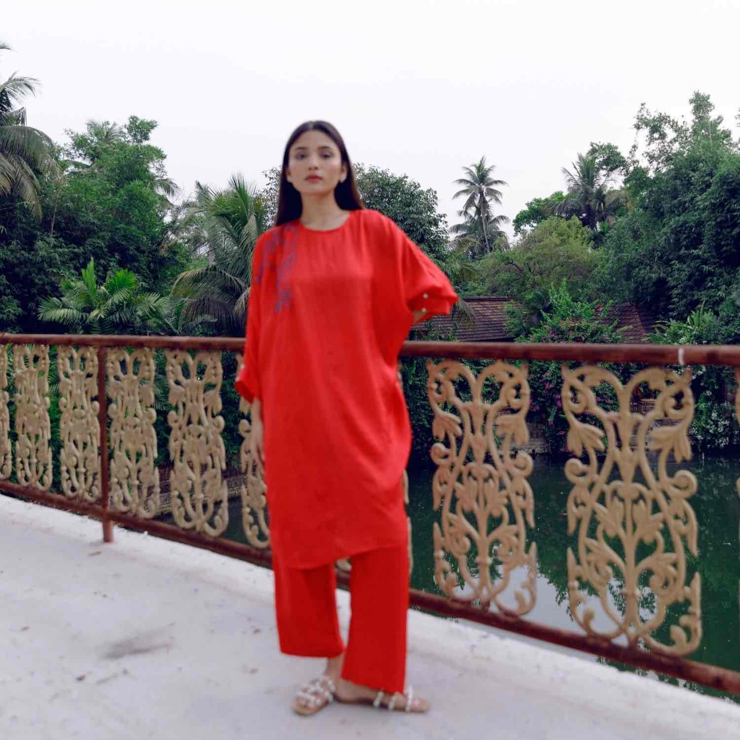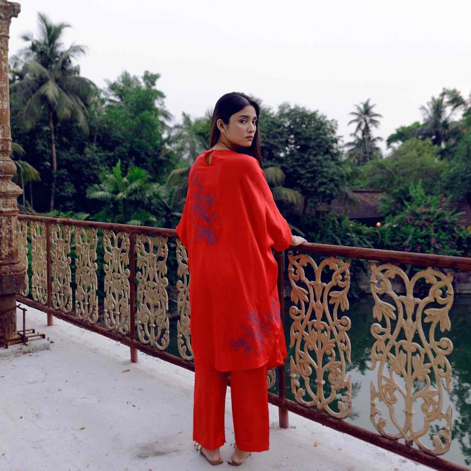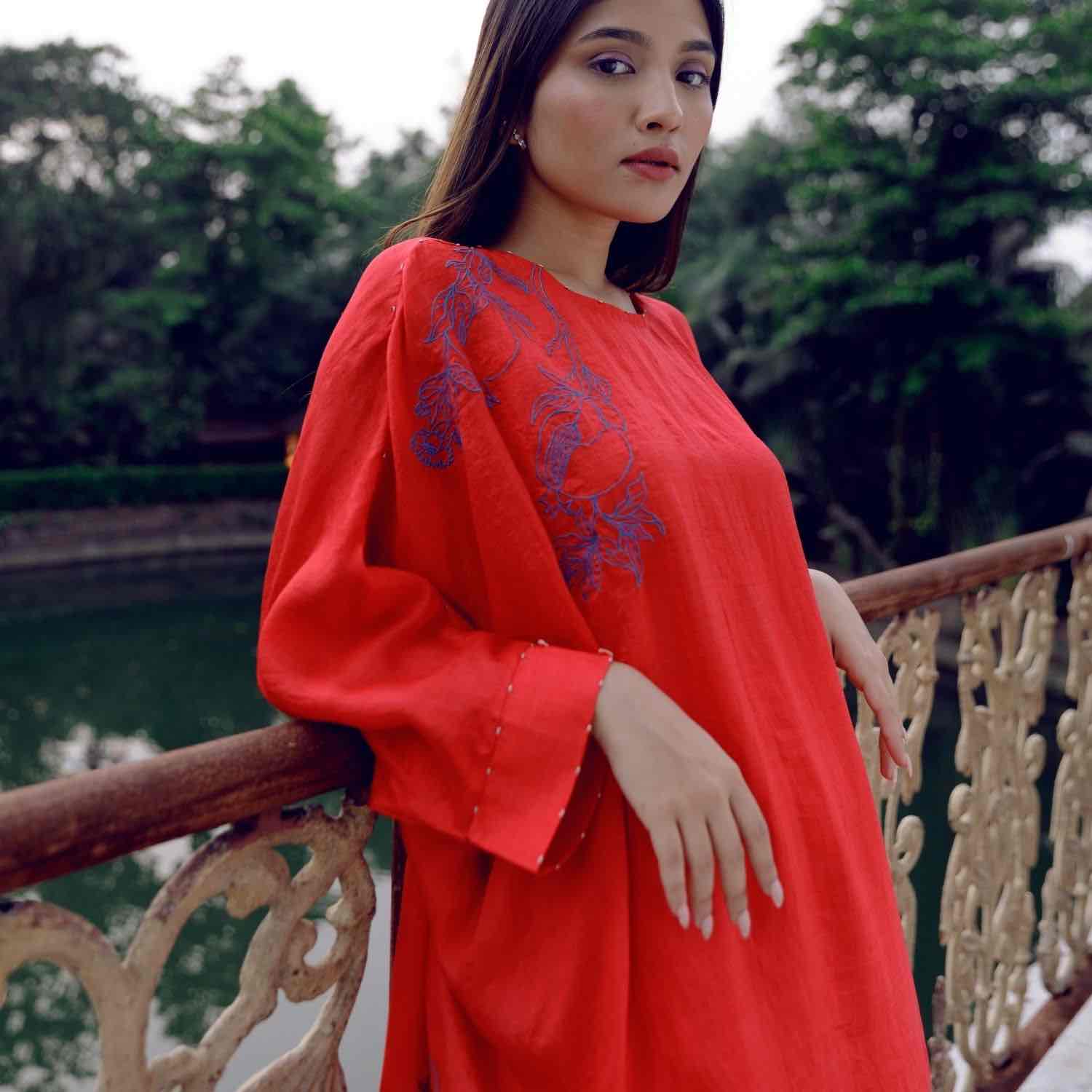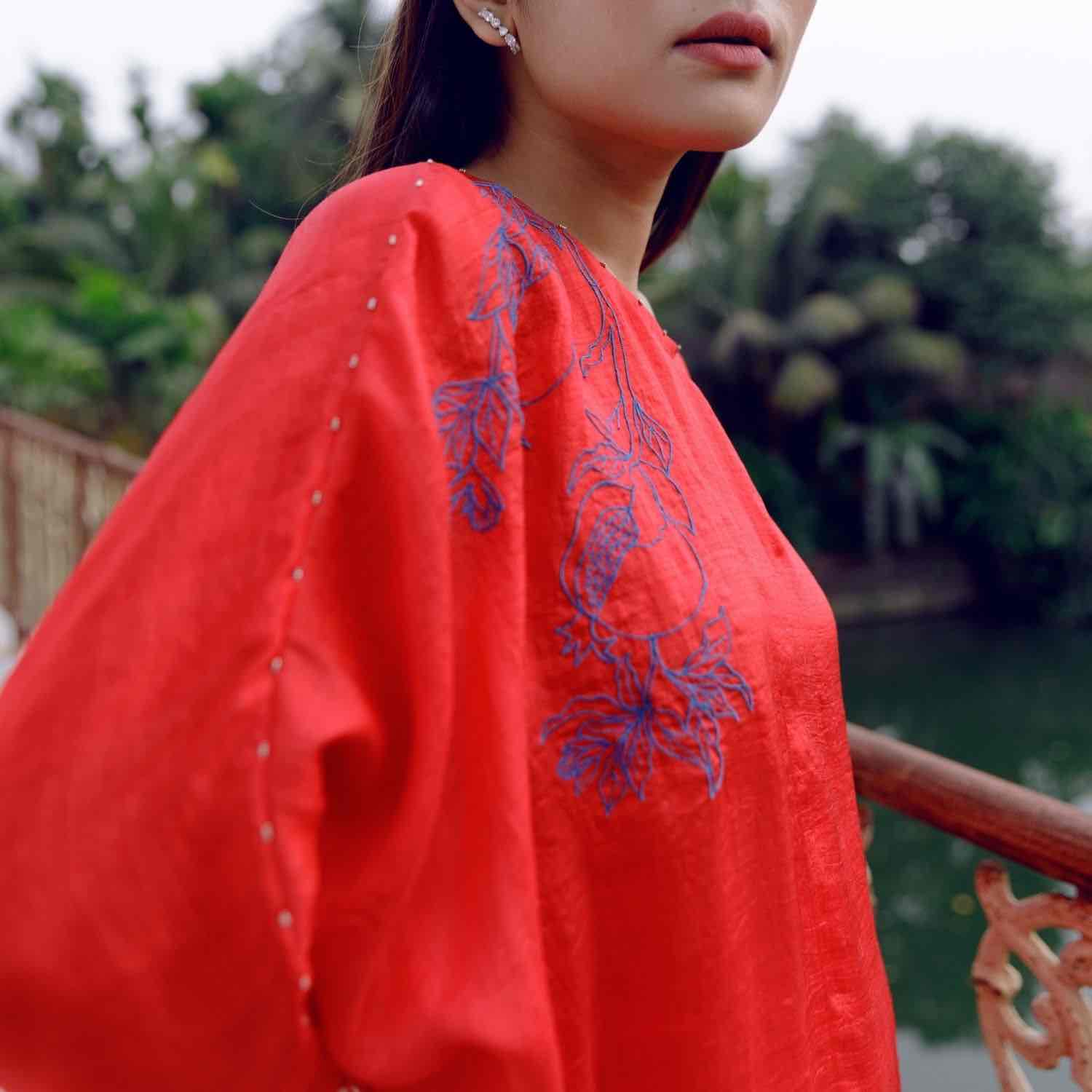 Showcase effortless elegance with our handwoven red mulberry silk tunic. It is adorned with intricate blue pomegranate embroidery and paired with straight-cut trousers. Style this set with understated accessories for an effortless look.