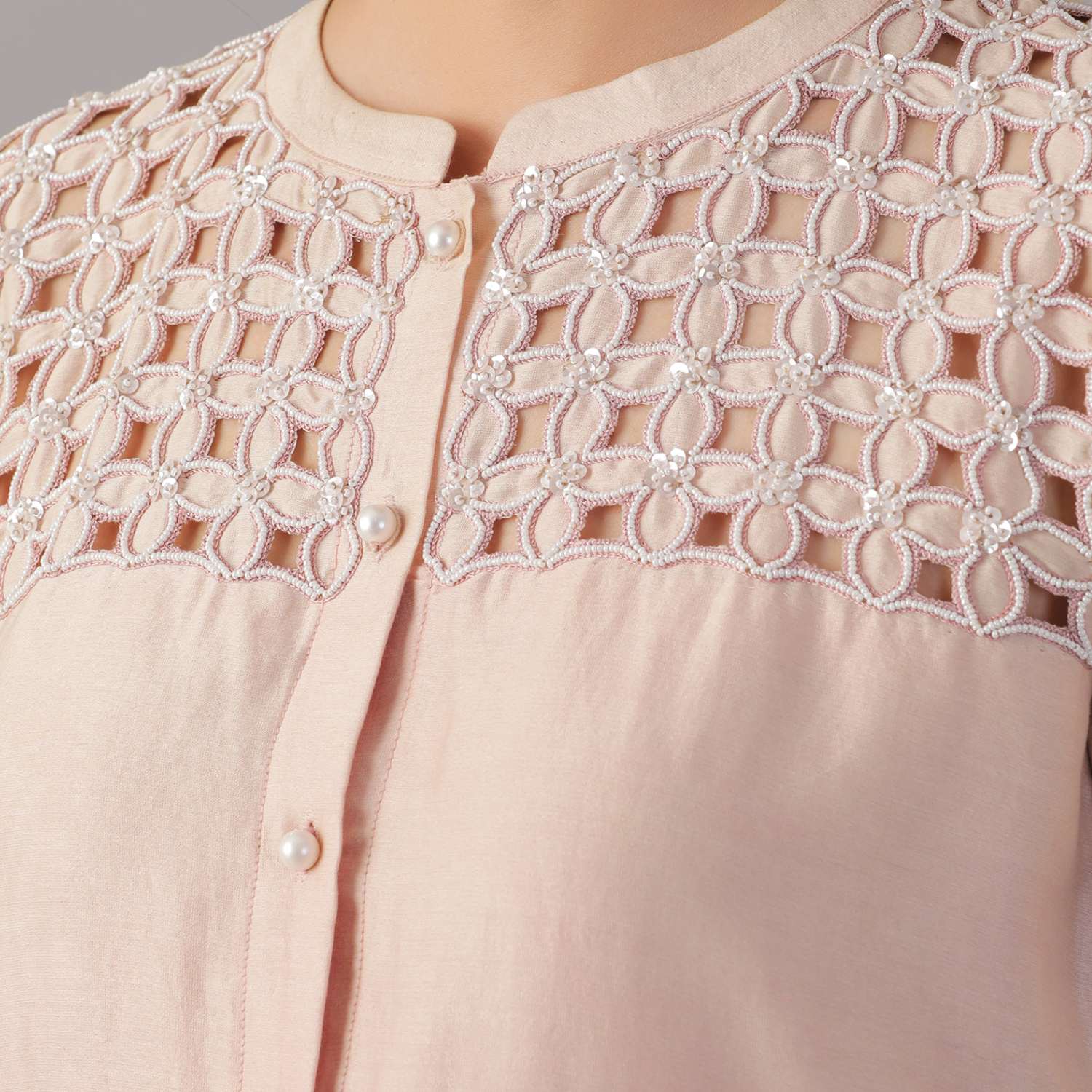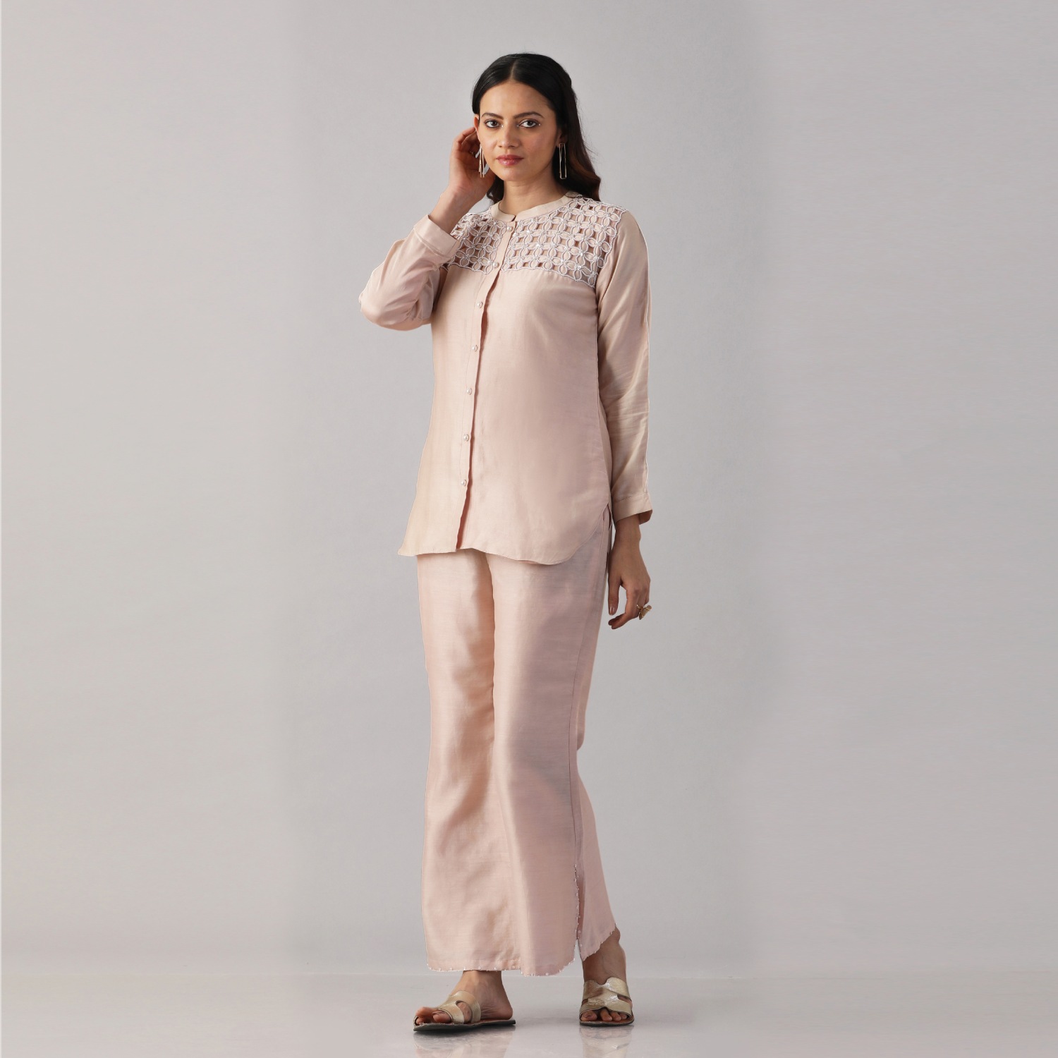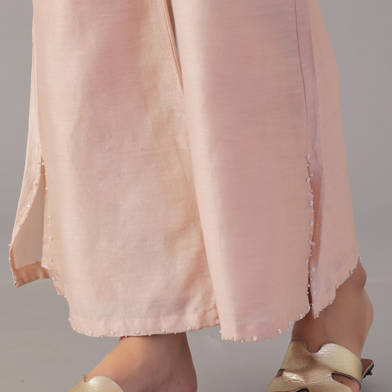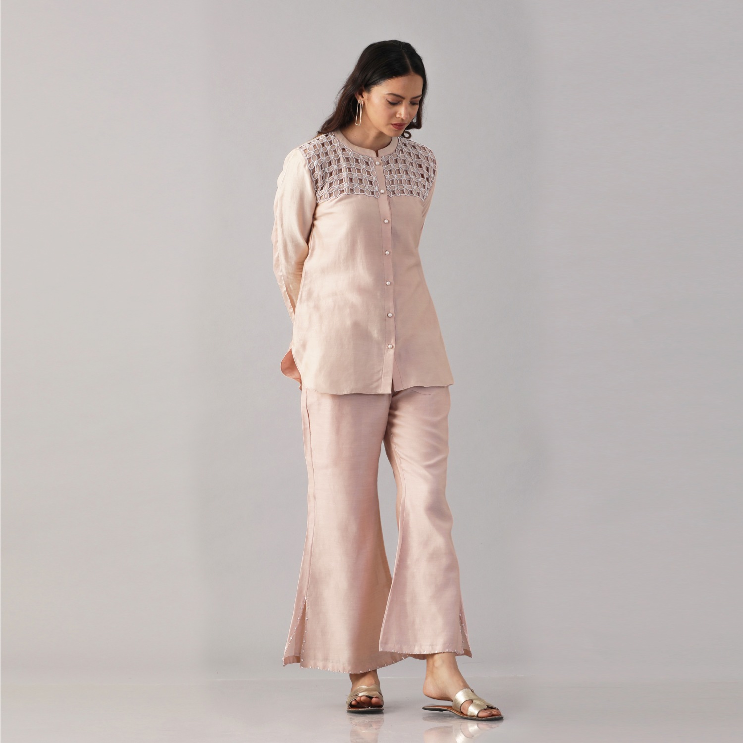 This beautiful set is crafted from luxurious chanderi silk fabric in a light pink shade. The shirt features full sleeves, intricate embroidery and a relaxed fit, offering elegance and comfort. The matching pants complement the shirt seamlessly. Pair this set with statement earrings, a sling bag and heels for a dressy event.