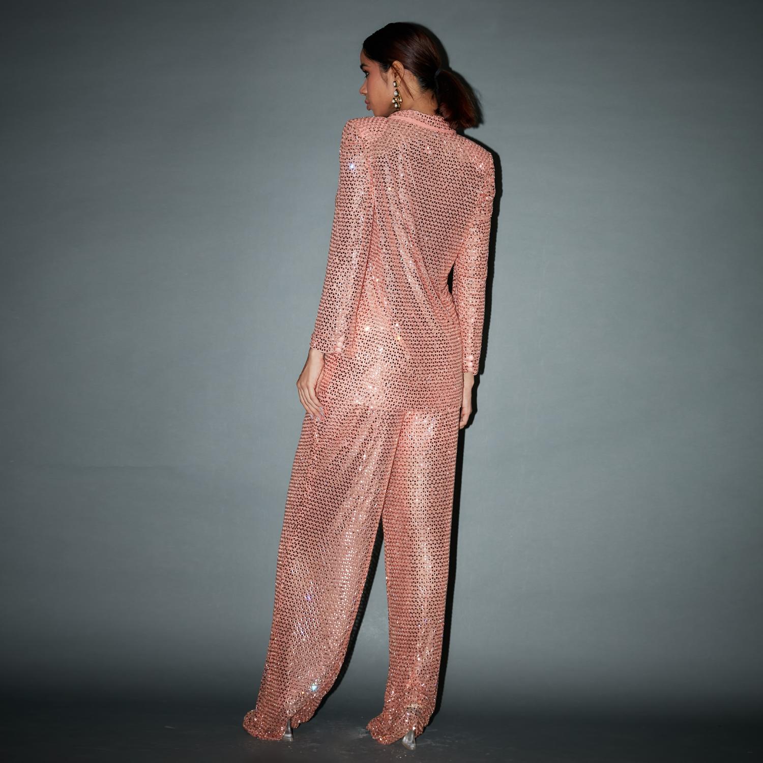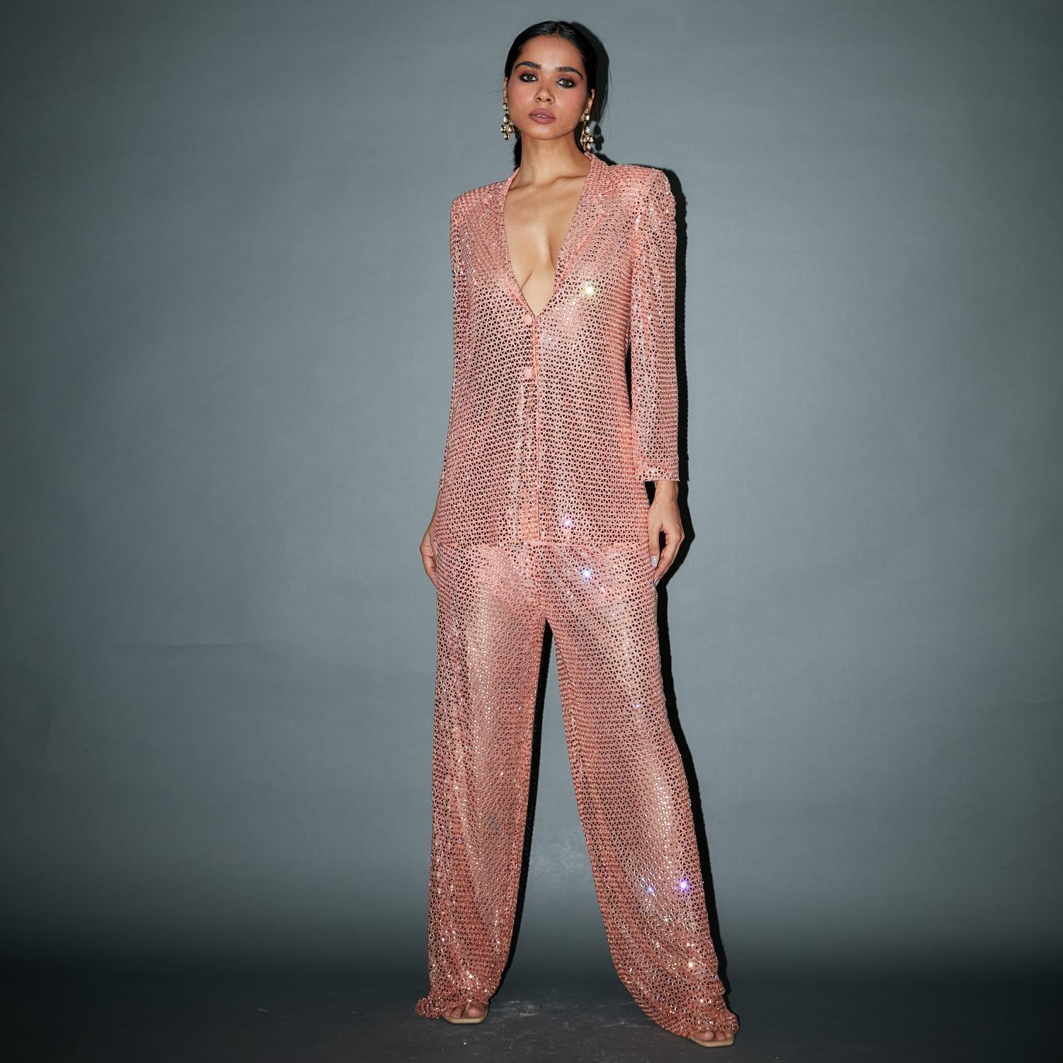 The dazzling allure of a peach triangle crystal-embellished jacket steals the spotlight, harmoniously paired with sleek straight pants and a chic belt. This ensemble radiates sophistication, blending modern style with timeless elegance, creating a fashion statement that captivates with its seamless fusion of glamour and refined tailoring.