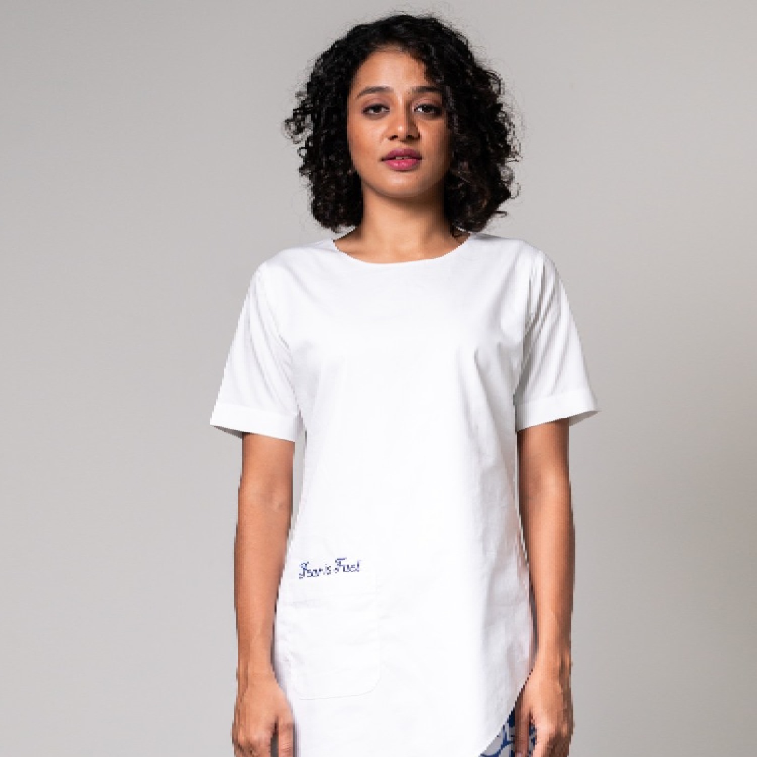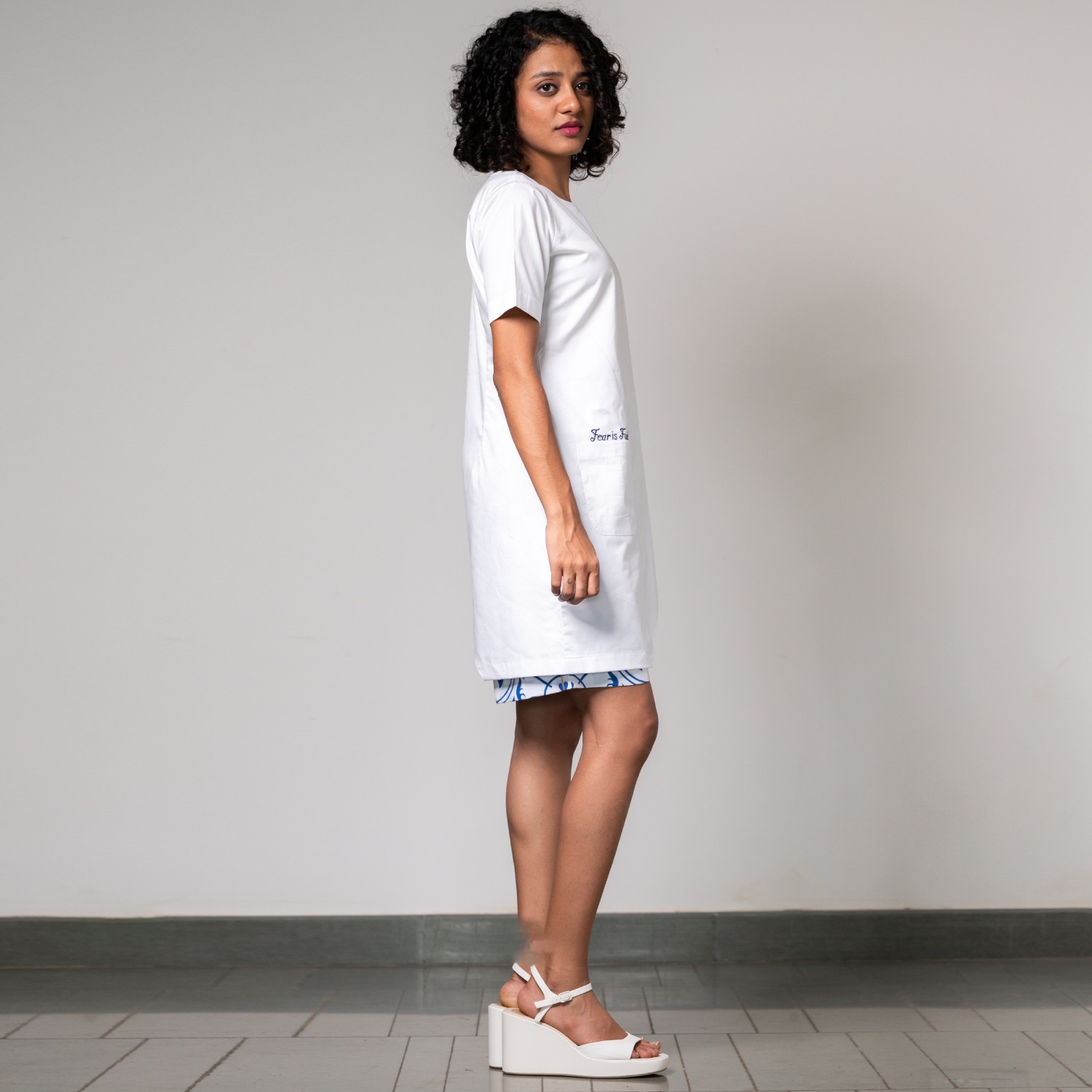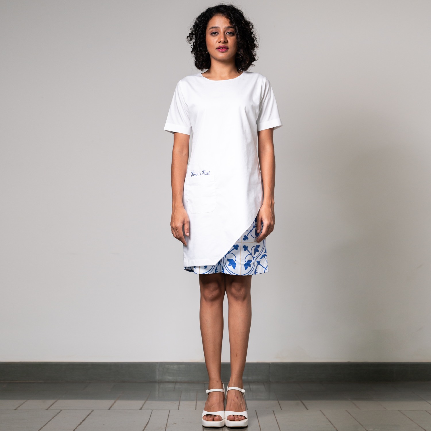 ₹ 6,825 (5% off)This stunning set is crafted from high-quality poplin fabric. It includes a white top featuring an asymmetrical hemline, half sleeves, and 'fear is fuel' written on it, adding detail to the look. The shorts come in a white shade with delicate blue prints, adding a pop of color. Pair it with pearl earrings and heels for a dressy event.