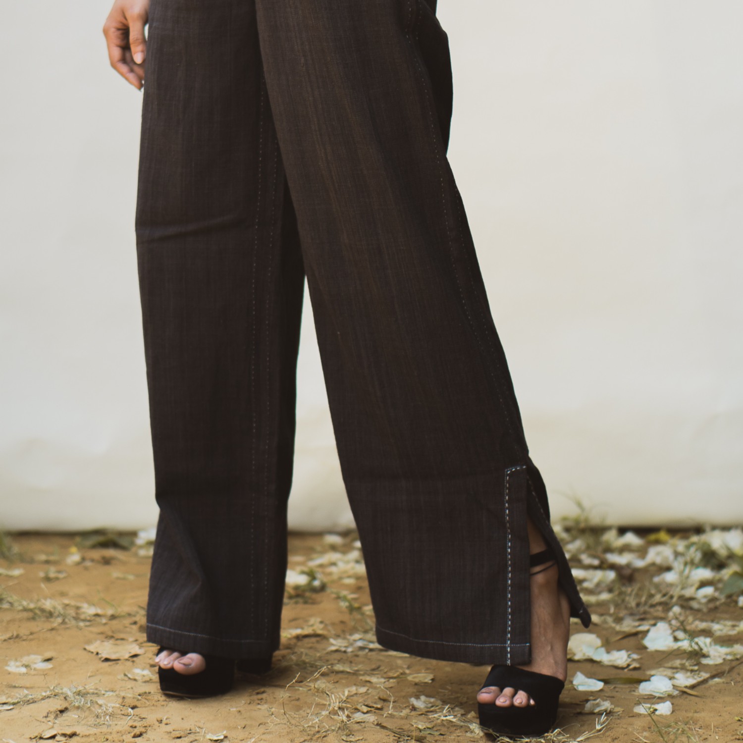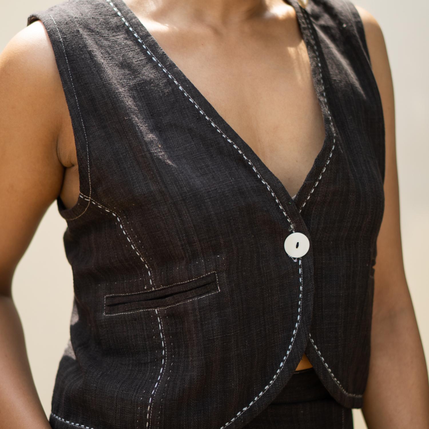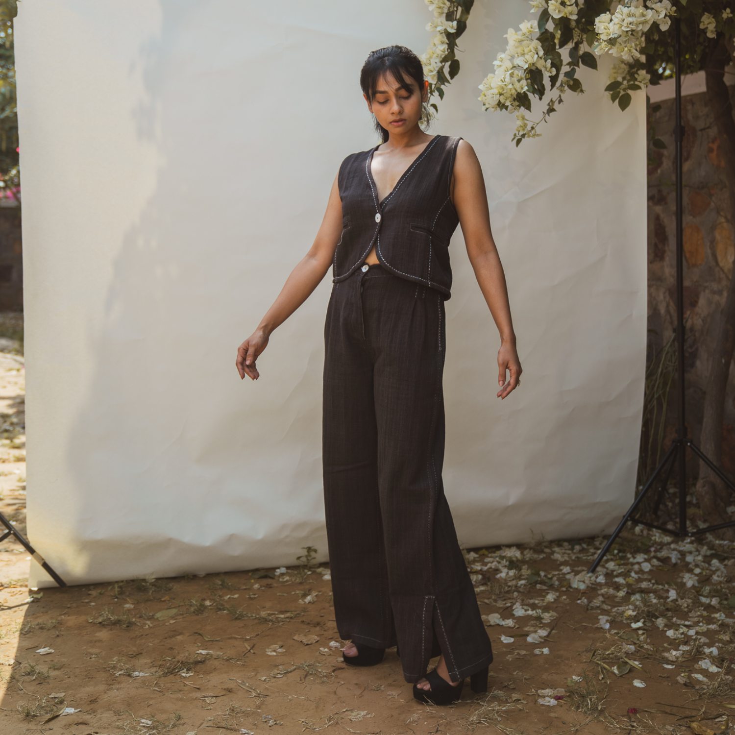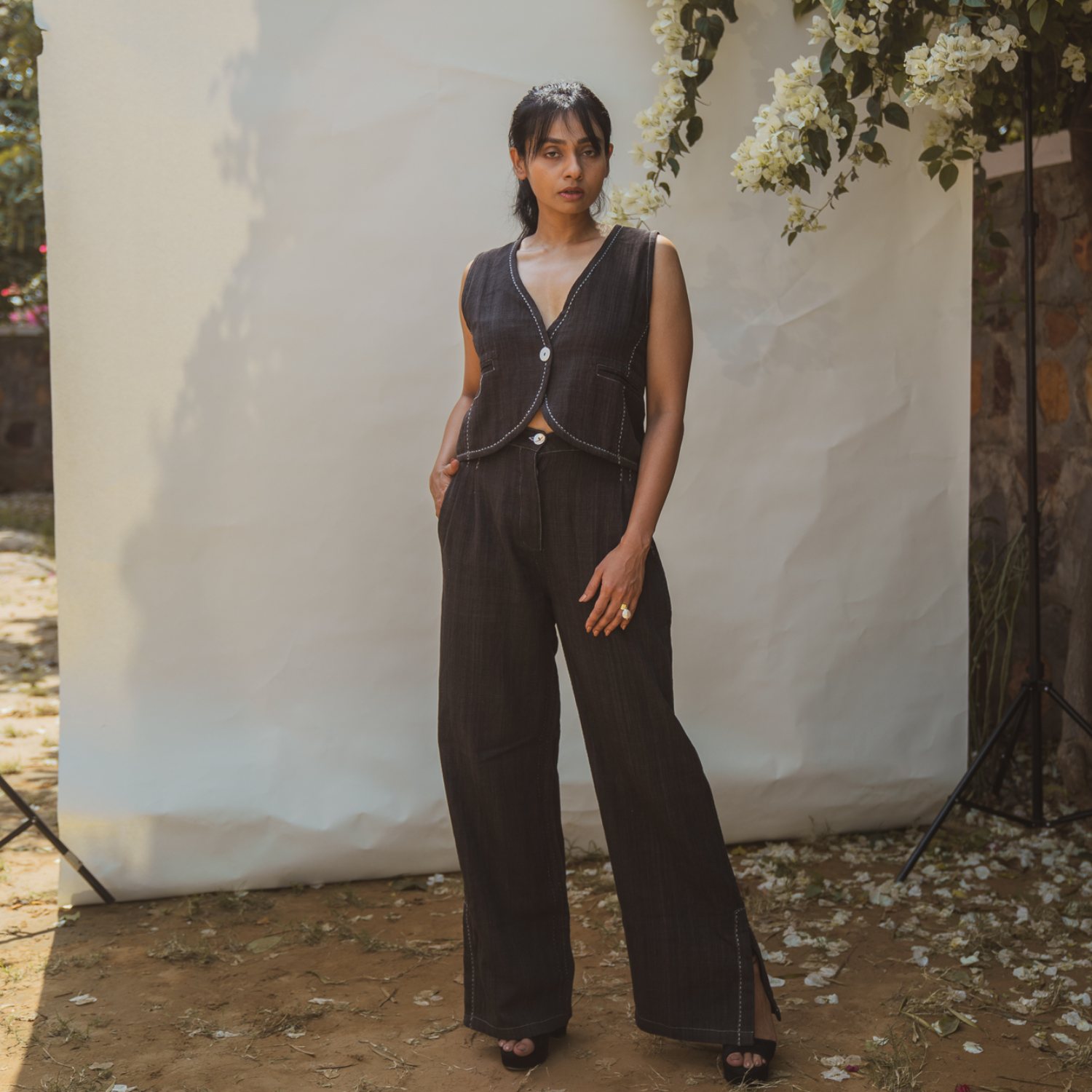 ₹ 18,499 (20% off)The sleeveless waistcoat features a soft round hem and drawstrings at the back for a customizable fit. Clean stitch lines along the panels and intricate hand embroidery add elegance to the design. The high-waisted cotton pants are designed with a slight flare and slits at the hem, giving them a trendy and elegant look. The cutaway pockets are adorned with stitch lines and kantha, matching the style of the waistcoat.
