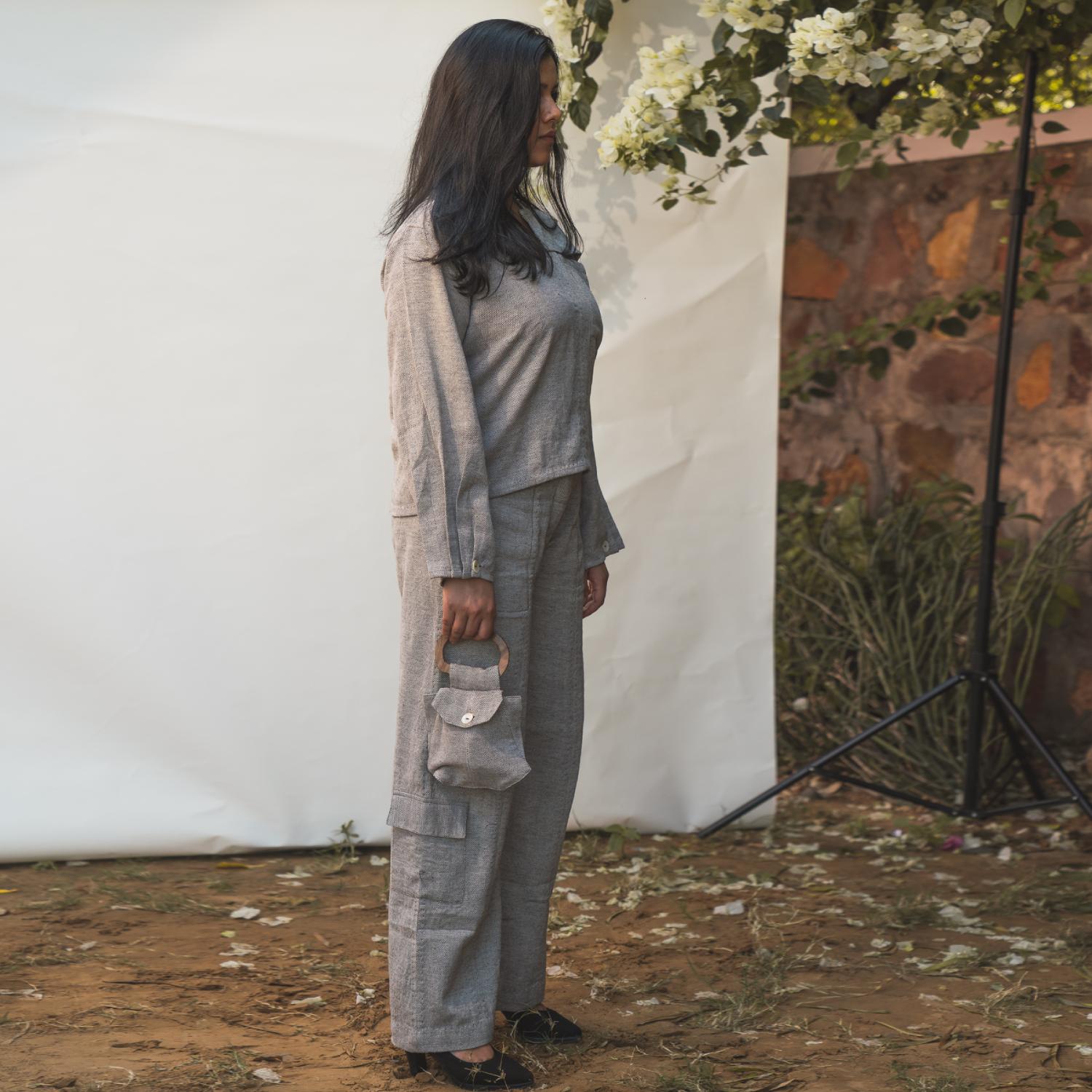 ₹ 18,499 (20% off)Crafted in a twill weave of black and white, creating a beautiful contrast. The pleated sleeve blouse features a relaxed sleeve silhouette that can be buttoned down with pleats, allowing you to adjust the look to your liking. The patch pocket pants come with a classic high waist fit and include four patch pockets, button-fly fastening, a narrow belt, and belt loops, providing functionality and style.