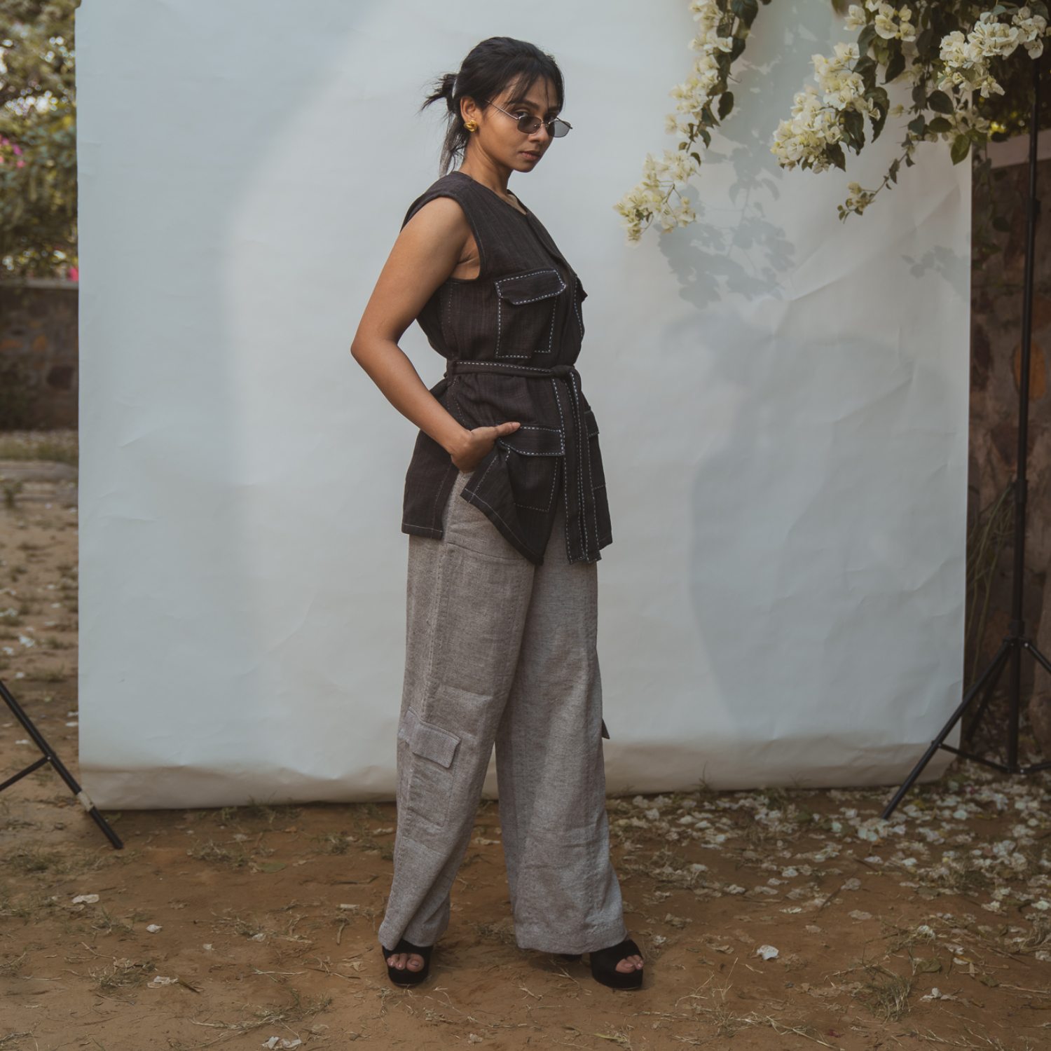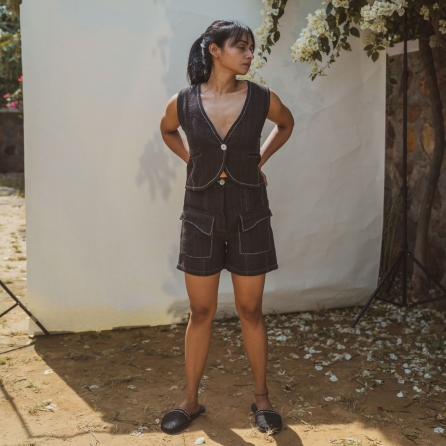 ₹ 18,299 (20% off)Crafted from high-quality cotton fabric, the utility vest is designed with a round neck and features four patch pockets. It is adorned with stitch lines and Indian hand embroidery along the patch pockets and belt, adding unique detailing. It includes an adjustable and removable belt, making it multi-functional and adjustable to your preference. The patch pocket pants come with a classic high waist fit and also feature four patch pockets for added convenience. They have a button-fly fastening, a narrow belt, and belt loops to ensure a secure fit and stylish look.