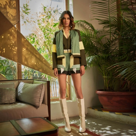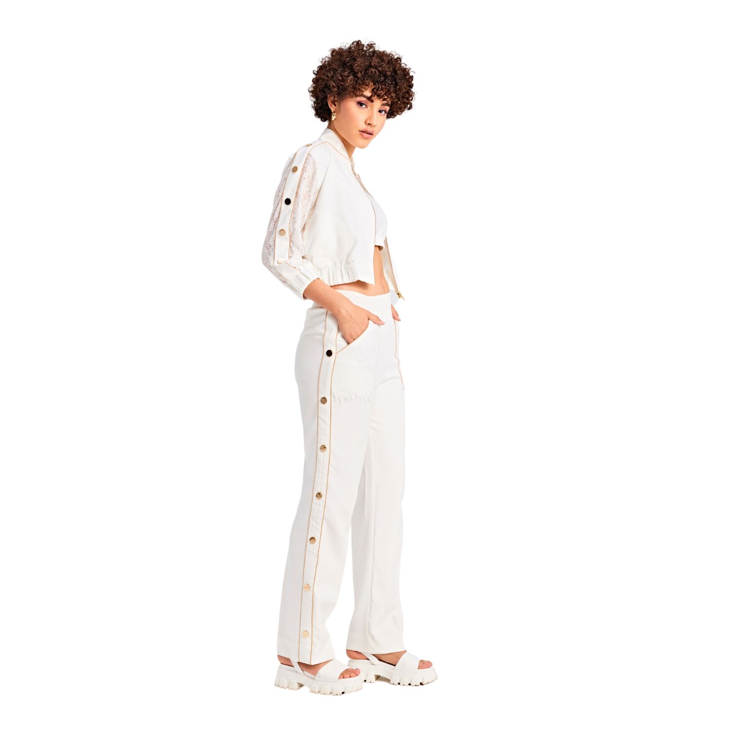 Get ready to turn heads and make a fashion statement with this stylish bomber jacket set. This crepe jacket features lace sleeves and gold button details. This set has matching straight joggers with lace pockets and a crop top.