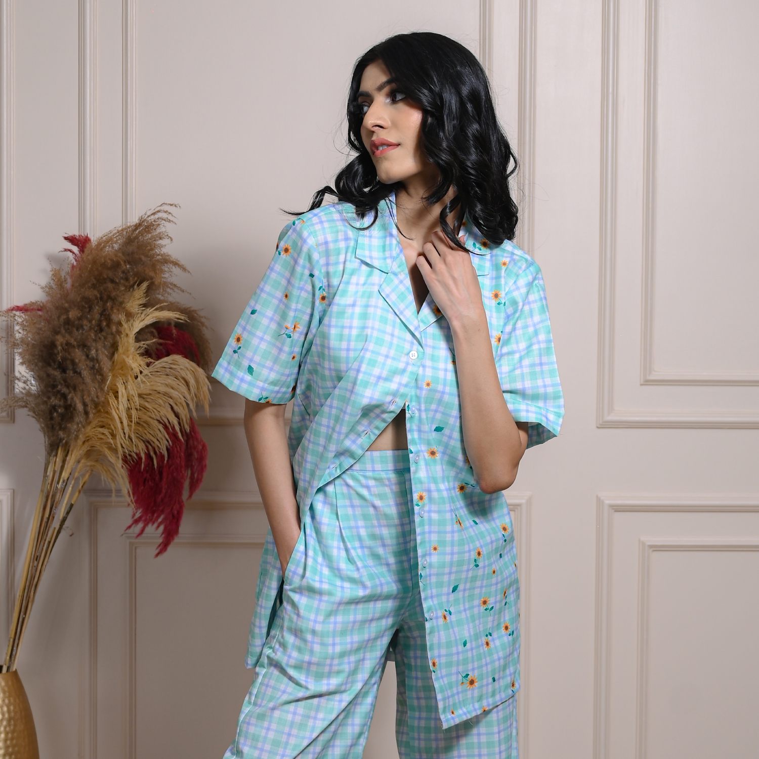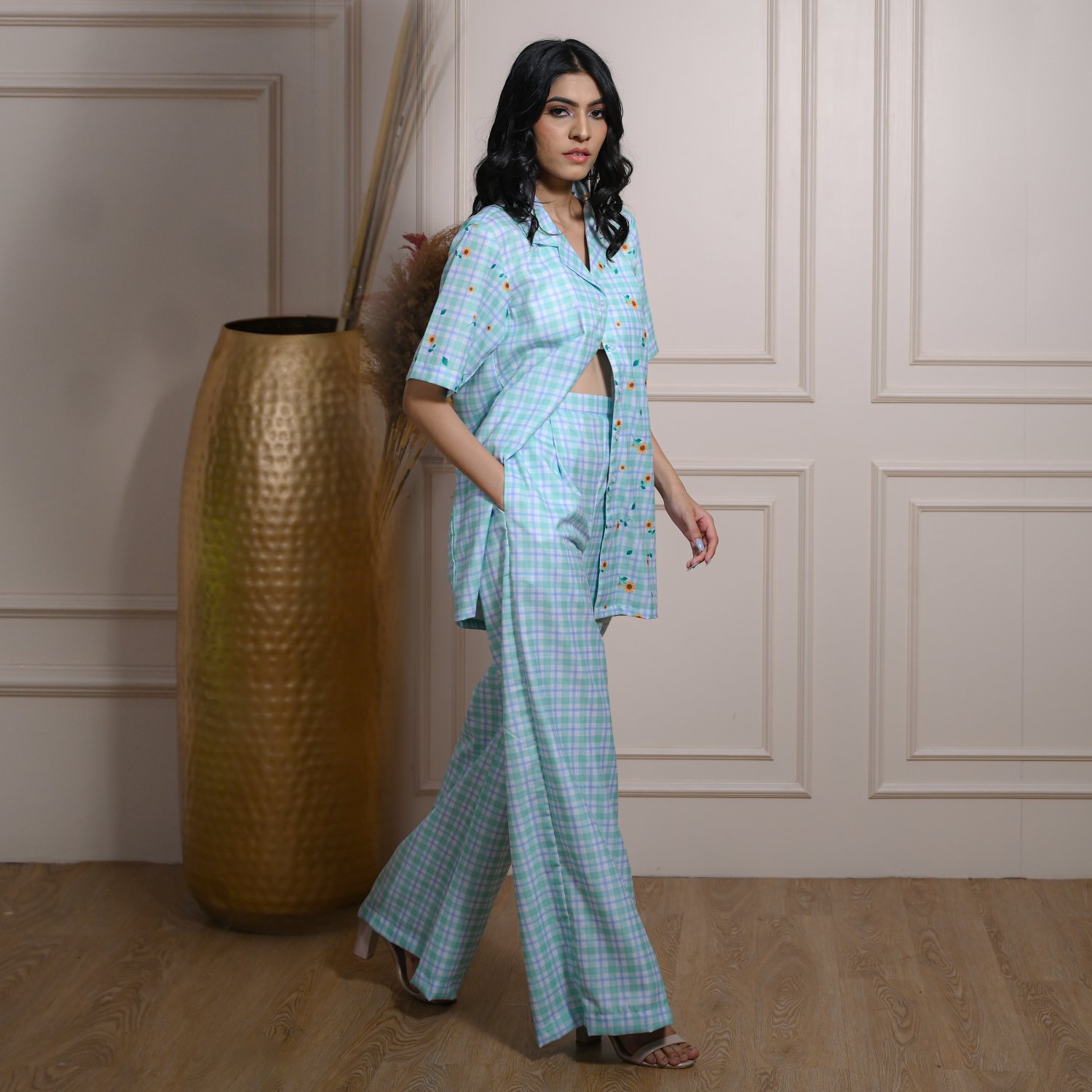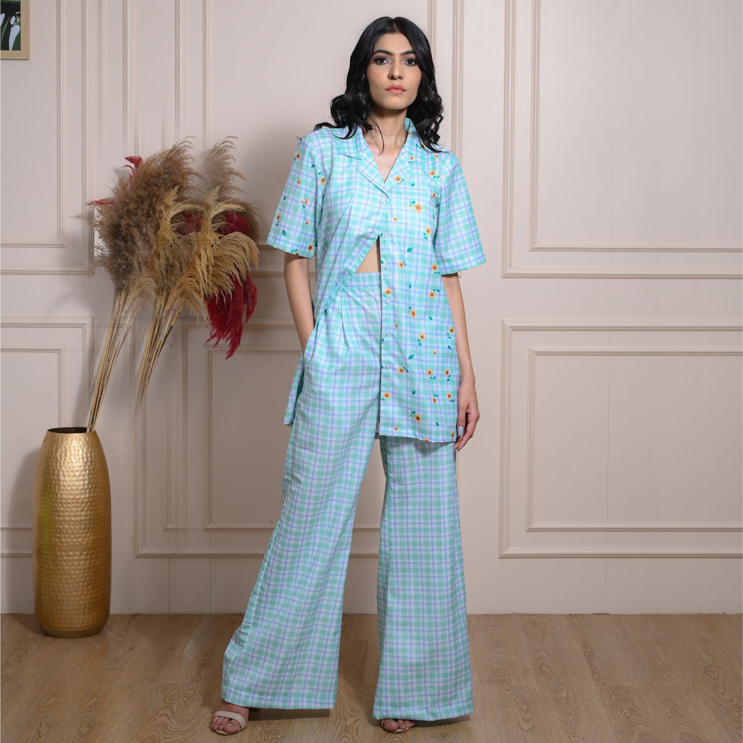 ₹ 3,700 (10% off)Crafted from pure cotton, this set features an adorable sunflower motif and a checkered print. The co-ord set includes a shirt and wide-leg pants, creating a cohesive look. The sky blue colour adds a cheerful and summery vibe to the outfit. Pair this with minimal jewellery and white sneakers for a casual day out with friends.