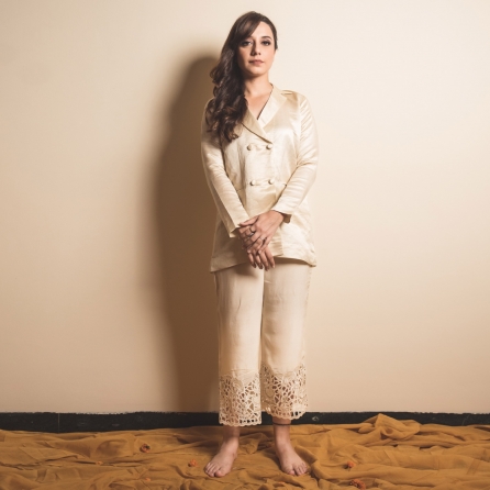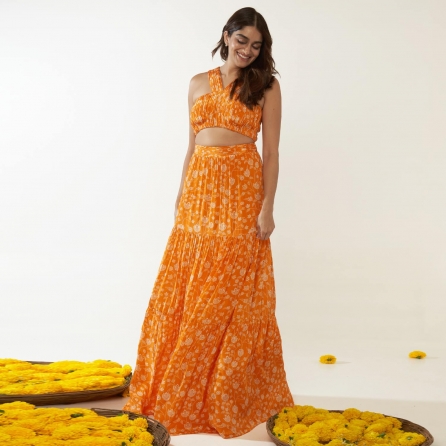 ₹ 7,490 (10% off)Step into elegance with our shimmering chanderi tissue top in tobacco brown paired with a matching flared skirt. The contemporary design featuring a front open V-neck top with red fabric buttons and a skirt with side pockets, seamlessly blends tradition and modernity. Handcrafted in India with 100% authentic chanderi and tissue fabrics both lined for comfort, this garment is made to order and versatile for festive evenings or formal wear.