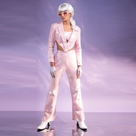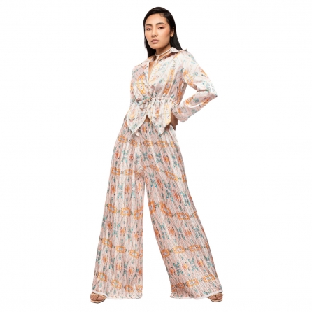 Step into elegance with this three-piece coordinating set featuring a pleated corset adorned with lined cups, high-waisted straight pants, and a full sleeve shirt highlighting bell sleeves. The ensemble is elevated with a captivating digitally printed design seamlessly blending modern aesthetics with timeless sophistication for a chic and versatile fashion statement.