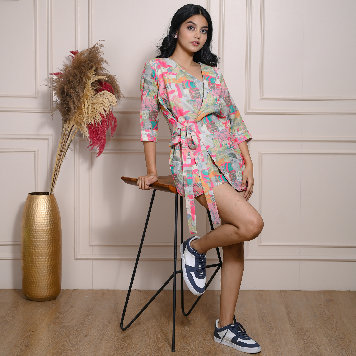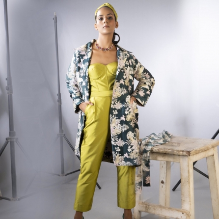 ₹ 3,500 (10% off)Crafted from cotton linen, this blazer features a unique double-breasted design with a side tie detail, creating a modern and flattering silhouette. The tropical multi-color pattern adds a playful and energetic vibe to your outfit. Layer this blazer over a tank top paired with high-waisted shorts for a fun beachy look.