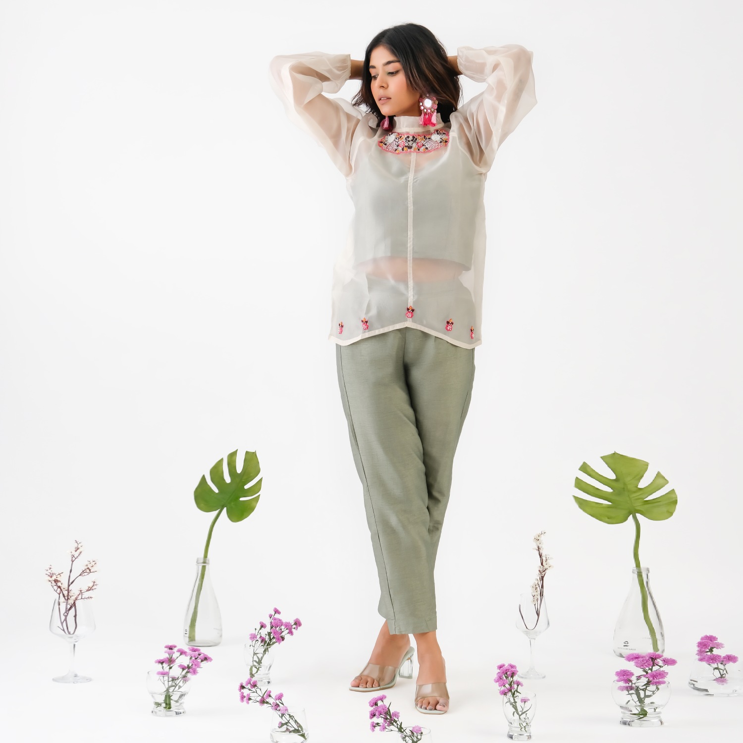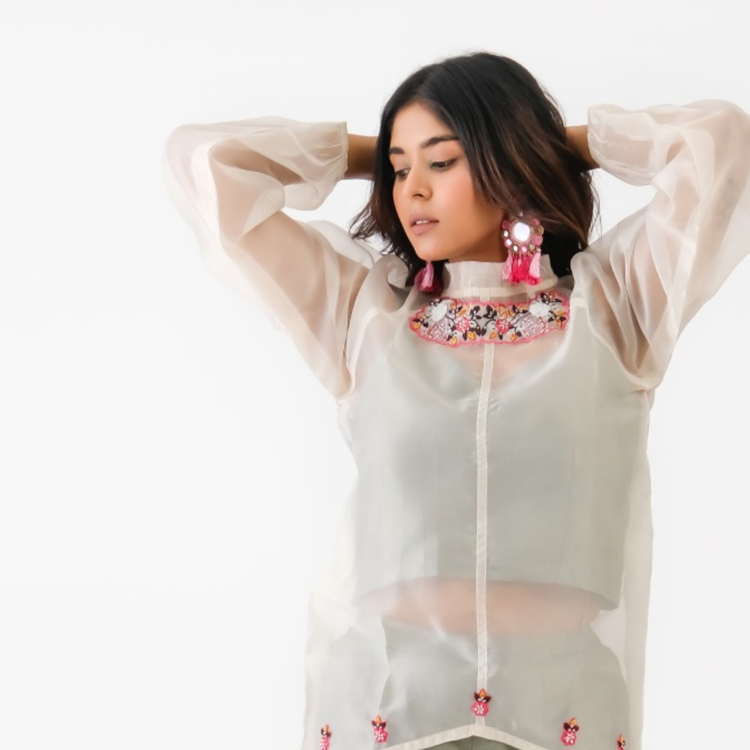 ₹ 8,999 (10% off)Crafted from high-quality and soft organza fabric, this set features a shirt with delicate hand embroidery on the neckline and hem. The contrasting inner and bottom add a vibrancy to the look. Style it with statement gold earrings and heels for a dressy soiree.