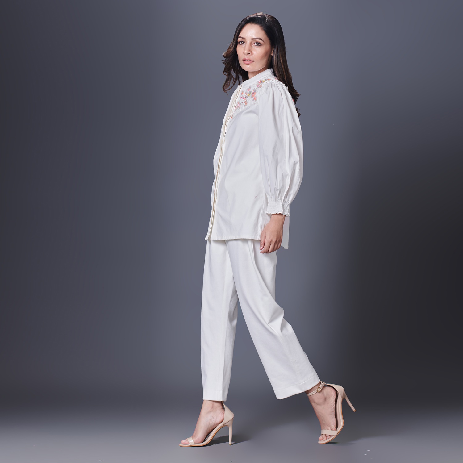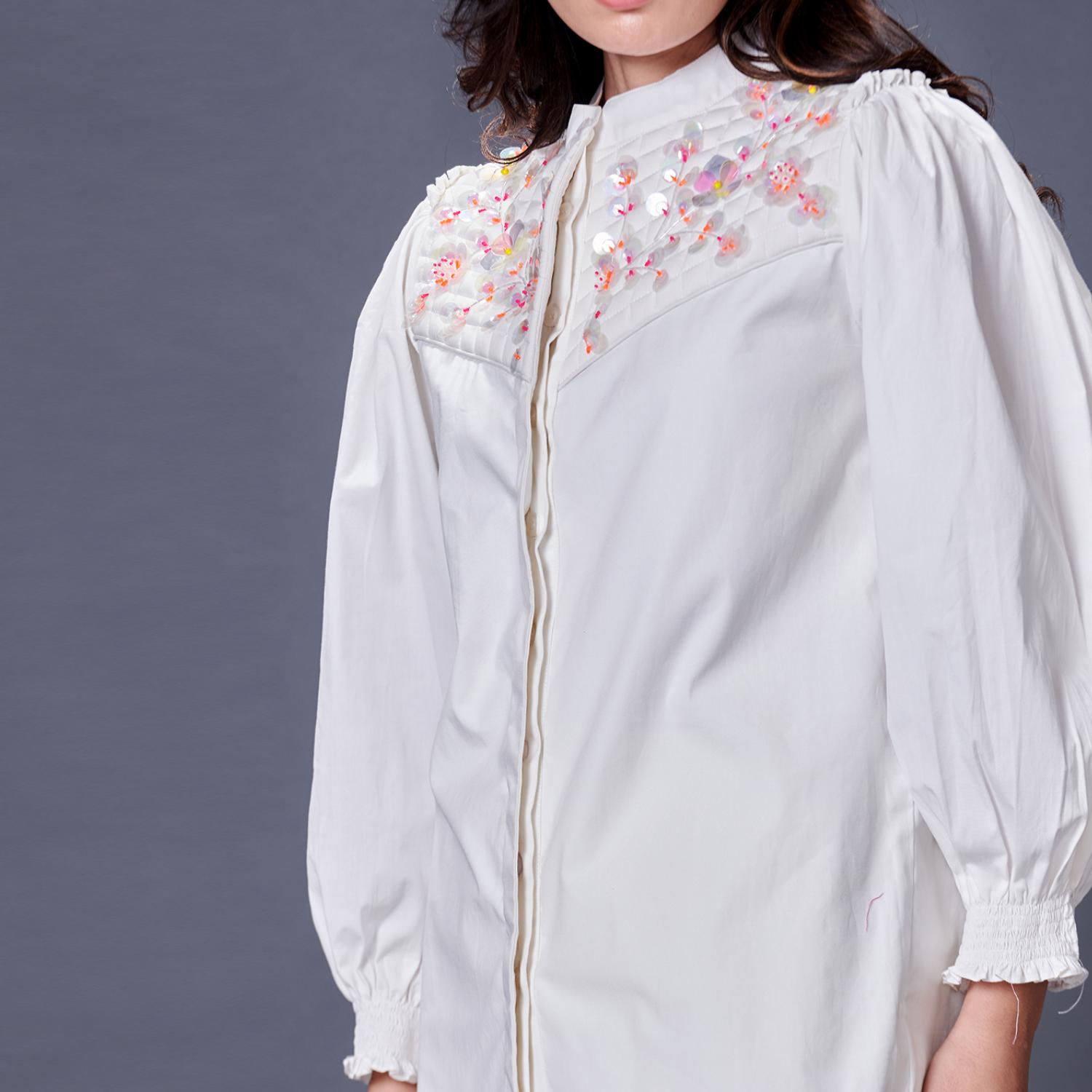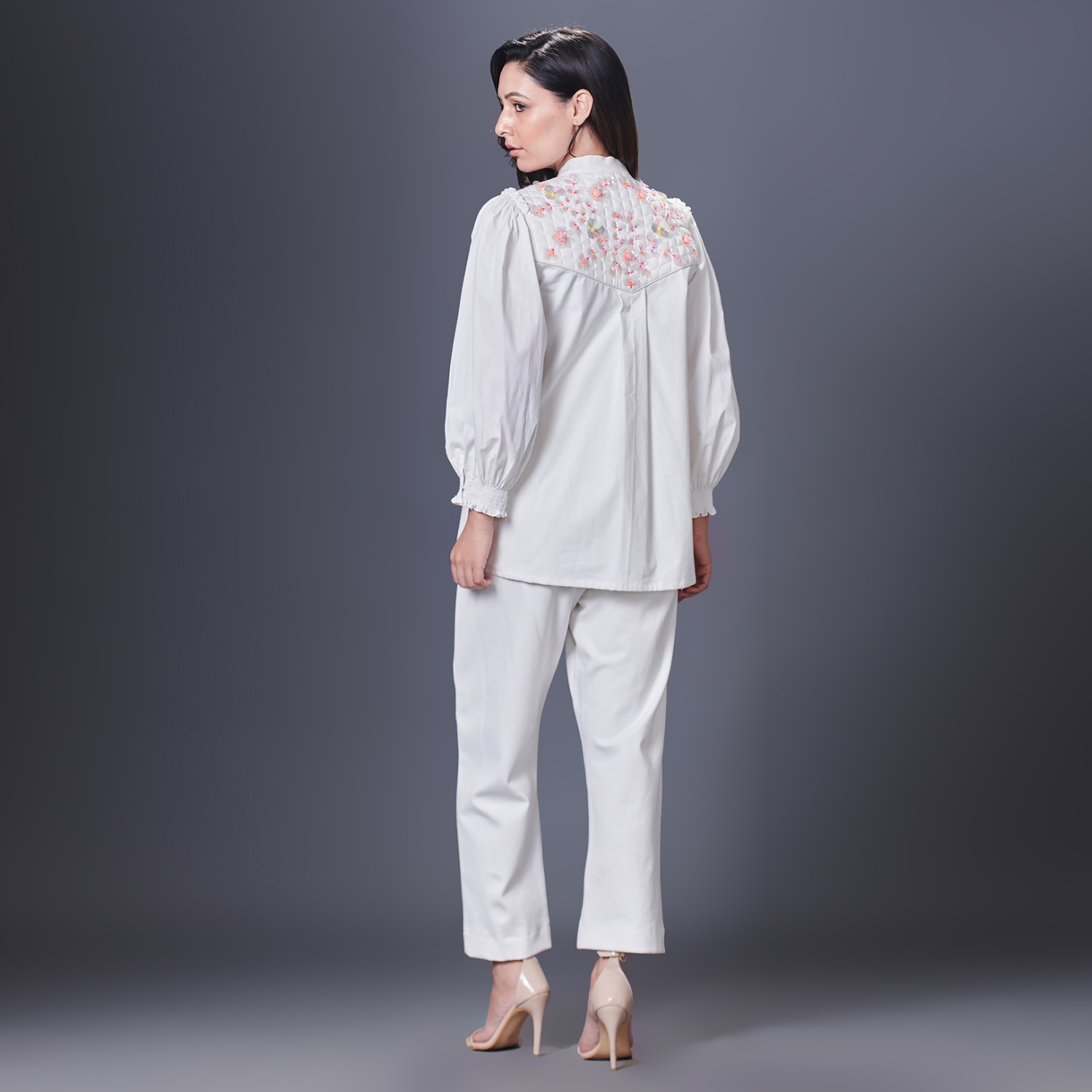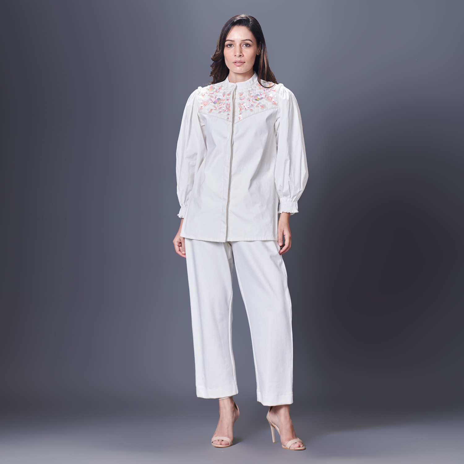 Crafted from soft cotton fabric, this beautiful Jacket comes in a classic white shade. It features a hand-embroidered quilted yoke, and balloon sleeves with elasticated cuffs for a stylish and comfortable fit. Style it with minimal jewellery and a clutch for a dressy evening soiree.
