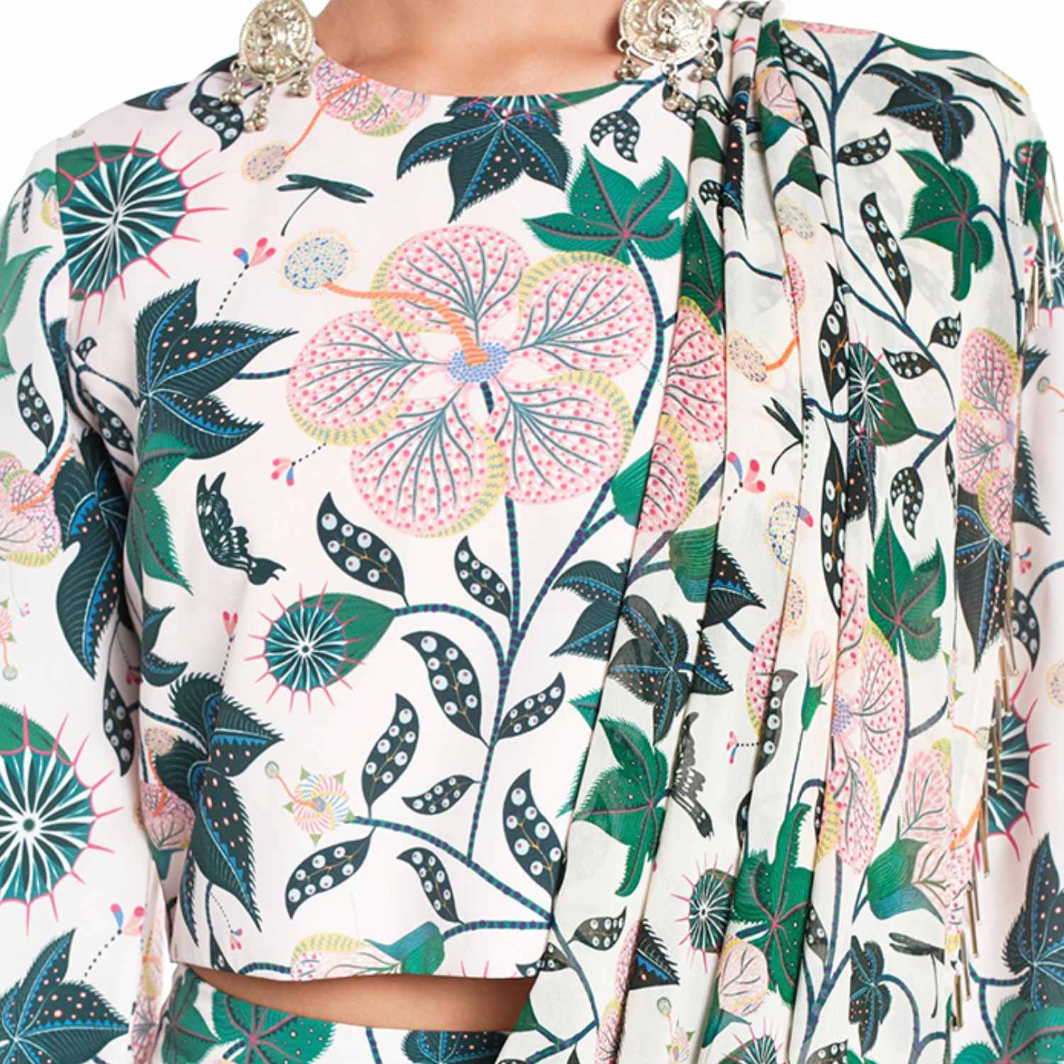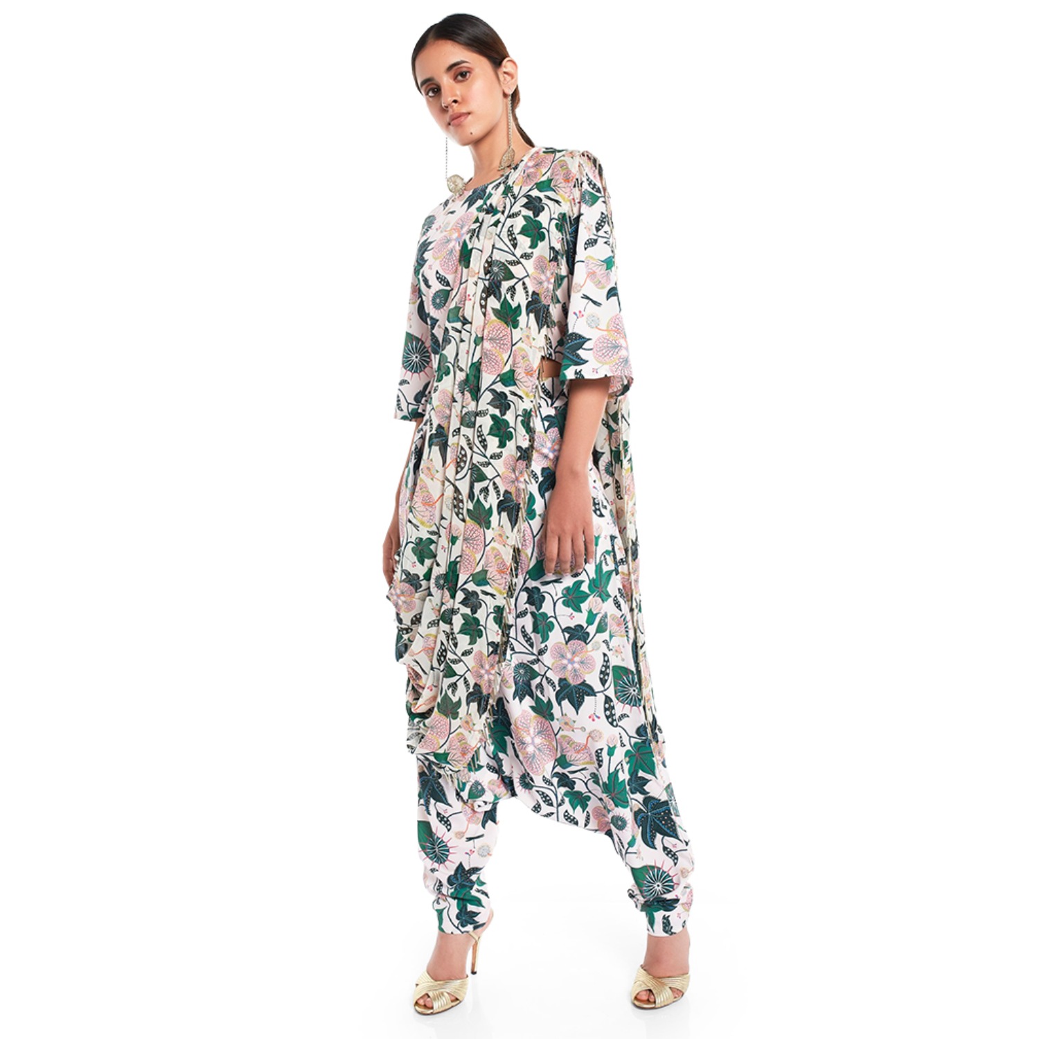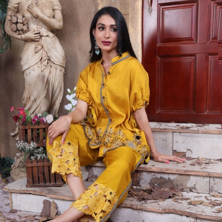 This stunning white set is crafted from high-quality crepe fabric. It features a top with an abuliton print and 3/4th sleeves. The top is paired with low-crotch pants featuring an attached georgette drape dupatta with tassel detailing, adding elegance to the look. Pair it with statement earrings and heels for a dressy soiree.