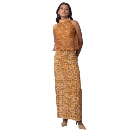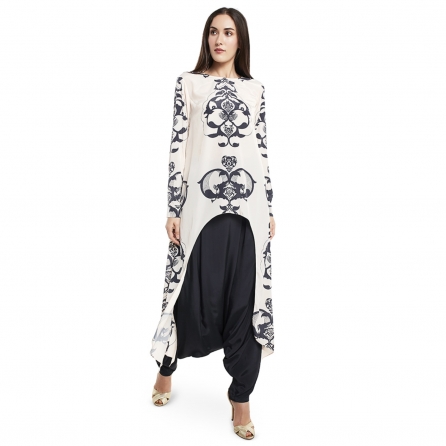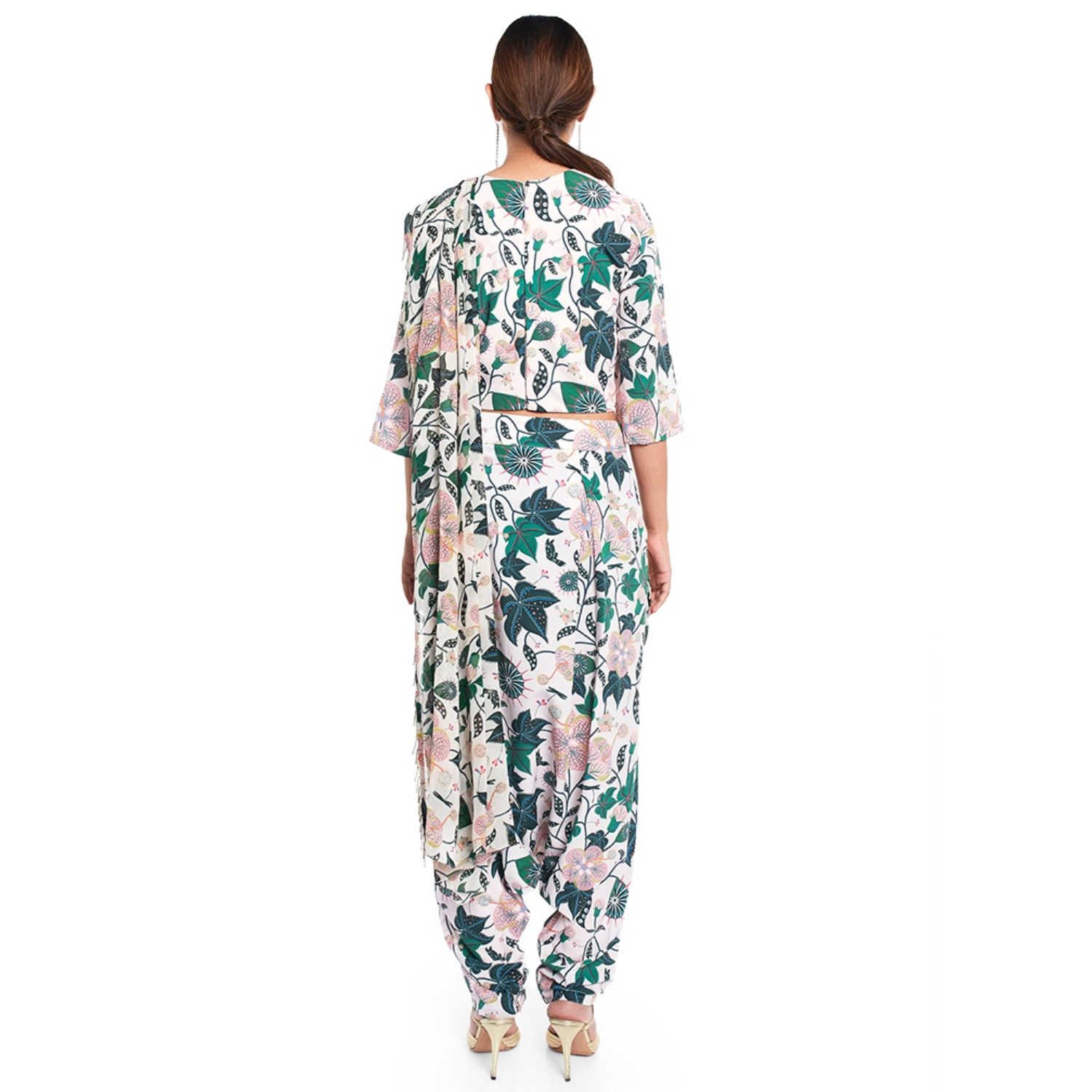 The white printed art crepe crop top paired with low crotch pants and an attached georgette drape dupatta forms a contemporary ensemble. The crop top showcases an artistic print, while the low crotch pants offer comfort. The attached georgette drape dupatta adds a touch of elegance, creating a stylish and unique outfit.