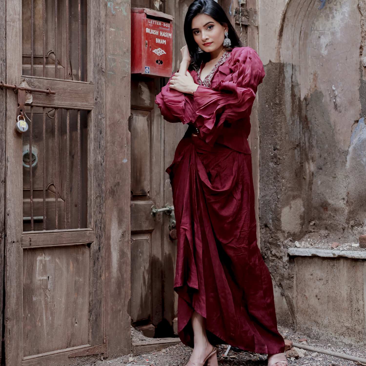 Draped skirt paired with an organza shirt having handwork on the collar, a potli with pleated sleeves, and a silk bustier.